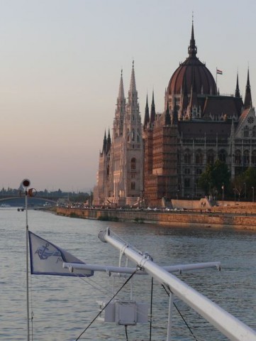 Das Schiff namens Rákóczi verliess pünktlich um 8 Uhr den Hafen am Vigadó Platz in Budapest. Die ca. 100 Gäste nahmen ihre Plätze an den schön gedeckten Tischen ein, manche eilten gleich aufs Deck und löschten mit einem kühlen Bier ihren Durst während sie den Anblick der Hauptstadt von der Donau aus bewunderten.