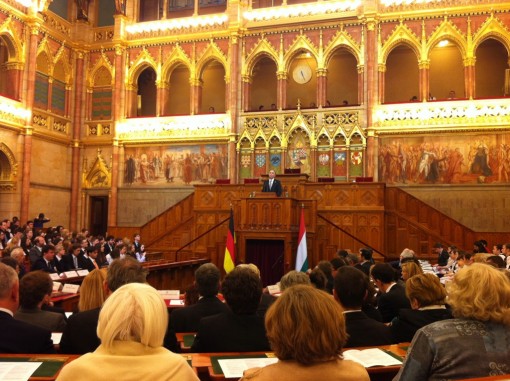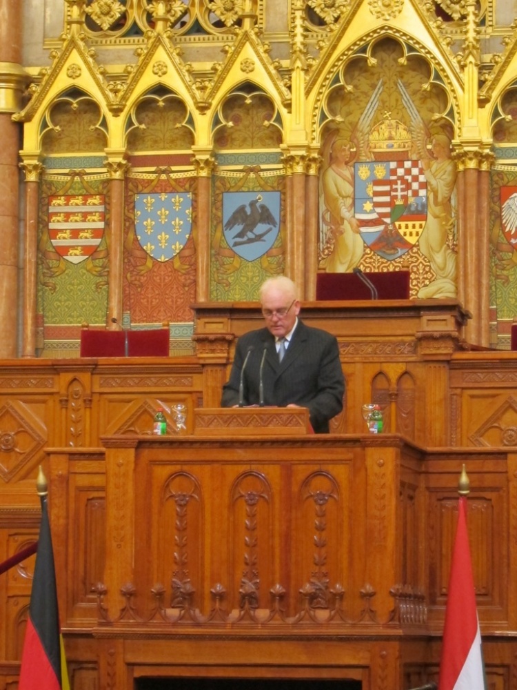 Prof. Dr. Norbert Lammert, Bundestagspräsident erinnerte an den Freundschaftsvertrag, der von Deutschland und Ungarn 1992 unterzeichnet wurde. Er unterstrich, dass kein Volk diskriminiert werden dürfte, bzw. Menschen aufgrund ethnischer Zugehörigkeit oder Glauben nicht unterschieden werden dürften. Denn wo einer Minderheit die Rechte aberkannt werden, dort kann das auch der Mehrheit widerfahren.