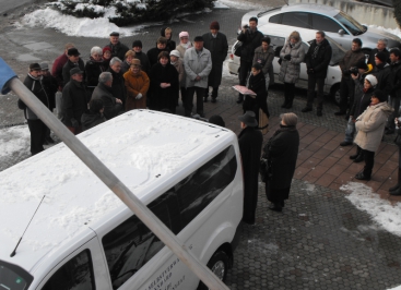Die offizielle Übergabe der Autoschlüssel durch Otto Heinek erfolgte vor dem Rathaus. Der LdU-Vorsitzende betonte, dies sei 2014 der erste und letzte Bus gewesen, der übergeben wurde. Dies bedeute nicht, dass es der einzige sei, doch aus verschiedenen Gründen habe sich die Übergabe verzögert. Nach der kurzen Ansprache und der Übergabe der Autoschlüssel segneten Pfarrer Josef Erb und Militärpfarrer Milán Markovics das Fahrzeug. Sie baten um Gottes Segen für alle, die mit diesem Bus jemals unterwegs sein werden. Gott möge den Bus und seine Insassen stets beschützen und sie auf ihren Wegen begleiten.