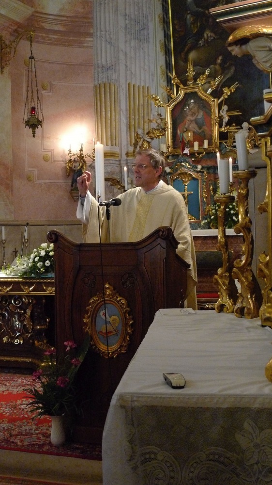 „Der heutige Tag ist ein Gedenktag. Wir gedenken der Tage 18. und 23.April 1946, an denen auf Grund der kollektiven Bestrafung 1960 Menschen – 60% der damaligen Bevölkerung – vertrieben wurden. Der Grund war ihre deutsche Abstammung, ihre deutsche Muttersprache […] Es ist schon 69 Jahre her, es leben immer wenige, die davon noch erzählen könnten, die es überlebt hatten. Erlauben Sie mir eine Zeitzeugin zu zitieren.” Nach der Zeitzeugenerzählung von Elisabeth Cservenyi (geborene Okeli) nun wurde wieder der Chor aufgerufen. Nach dem Lied „Milde Königin….“ gerichtet an die Schutzpatronin der Schaumarer Kirche, vorgetragen vom Traditionspflegenden Frauenchor geleitet von Ditta Schreiber Kánya bat man István Szabó, den Vorsitzenden der Generalversammlung des Komitates Pesth die Festrede zu halten.