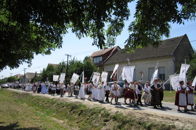 Das Fest begann mit dem Einzug der Trägerinnen in die Kirche. Mädchen und Frauen in der Volkstracht ihrer Gemeinde trugen die tragbaren, mit Blumen verzierten Marienstatuen auf ihren Schultern. Die feierliche Messe – außerhalb der Kirche unter einem Zelt – zelebrierten Erzbischof Dr. Blasius Bábel von Kalocsa-Kecskemét und Pfarrer Tibor Szűcs, der vor 25 Jahren seinen kirchlichen Dienst begann und auf dieser Messe sein silbernes Priesterjubiläum feierte. Der „Silberpfarrer“ dient den römisch-katholischen Kirchengemeinden in Gara, Juritsch/Bácsszentgyörgy und Waschkut. Auf seinem Andachtsbild steht: „Geht hinaus in alle Welt und verkündet das Evangelium allen Geschöpfen.” (Mk 16, 15) Die Gratulationsrede wurde auf der Messe vom Waschkuter Bürgermeister Zoltán Alszegi gehalten. Im Namen der Gläubigen bedankte er sich für den opfer- und hingebungsvollen kirchlichen Dienst. Der Erzbischof sprach in seiner Predigt über die Wichtigkeit der Traditionen. Die Religion ist ein Teil unserer Identität, Vergangenheit, Gegenwart und Zukunft. Der Glaube gibt uns Kraft, die alltäglichen Sorgen, unser Kreuz zu tragen. Maria bedeutet uns immer die Hoffnung, von der wir Kraft, Ausdauer und Trost schöpfen können. Die Werte bereichern uns. Die Trägerinnen der Statuen sorgen für die Bewahrung der religiösen Traditionen. Das wohl bekannte Marienlied „Glorreiche Königin“ gab der feierlichen Messe den innigen Rahmen. Erzbischof Blasius freute sich über die abgeschlossene Renovierung des Turmes der 135-jährigen Kirche. Die Messe endete mit der durch die Waschkuter Anton-Kraul-Blaskapelle musikalisch begleiteten Prozession und dem abschließenden Gottessegen „Vergelt’s Gott“.
