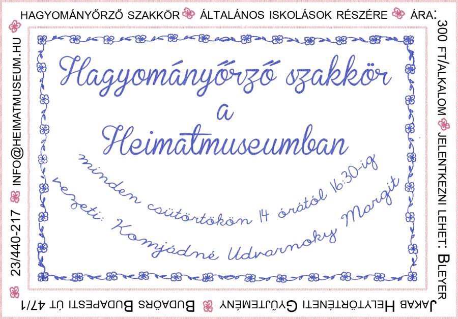 Zeitpunkt der Beschäftigungen: donnerstags von 14 Uhr bis 16:30. Teilnahmegebühr: 300 Ft / Anlass