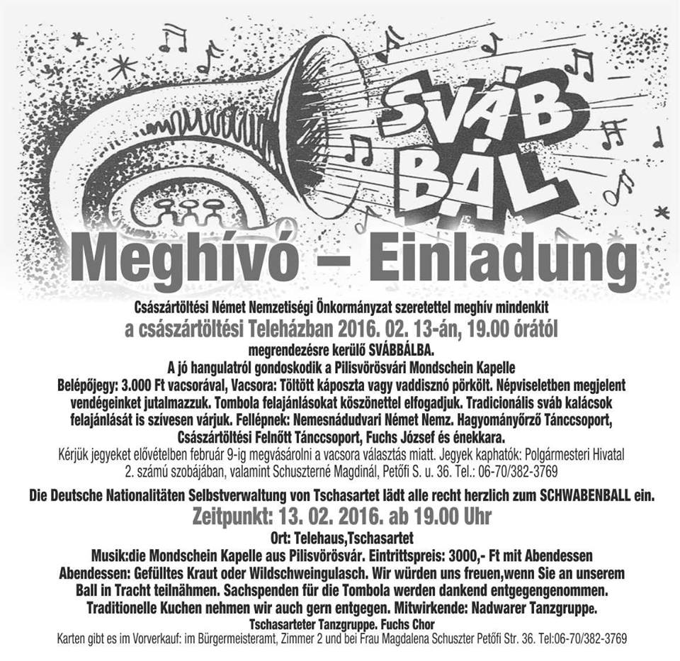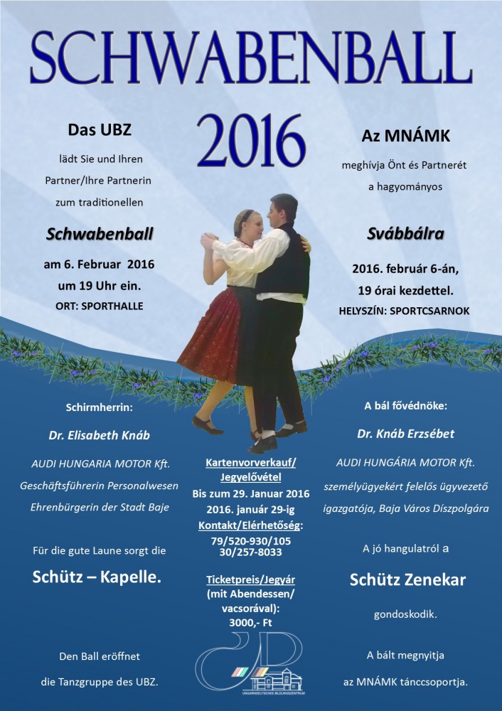 Das Ungarndeutsche Bildungszentrum Baje lädt Sie und Ihren Partner/Ihre Partnerin am 6. Februar 2016 um 19 Uhr zu seinem Schwabenball ein.