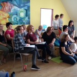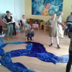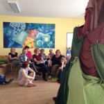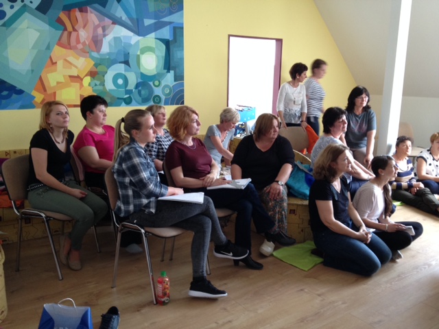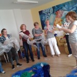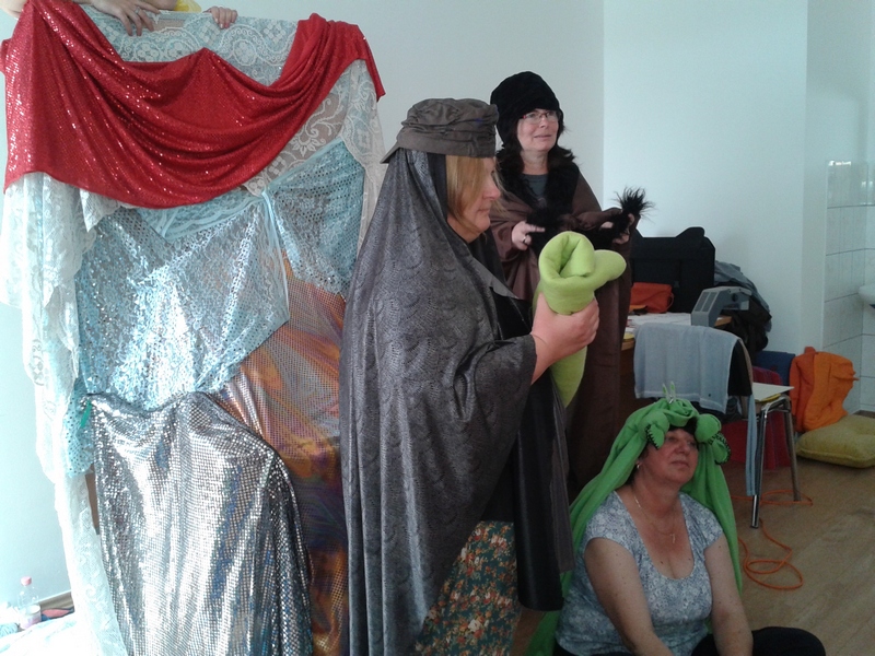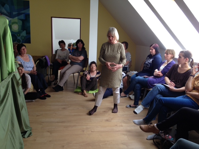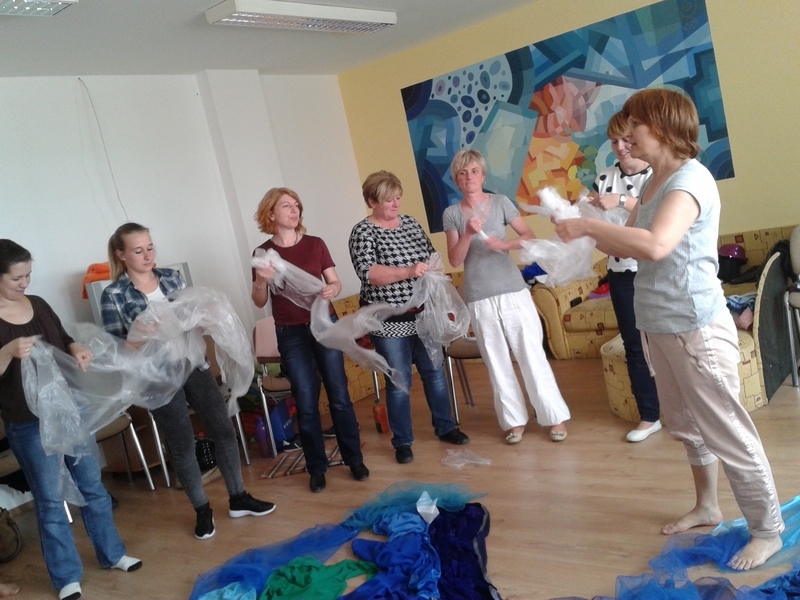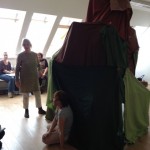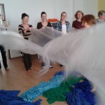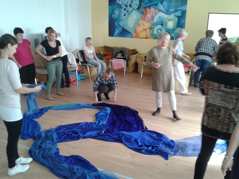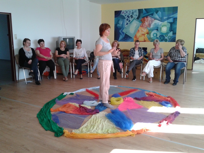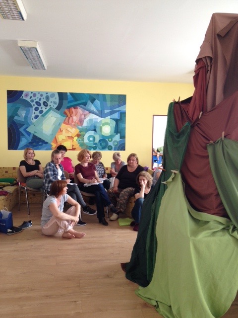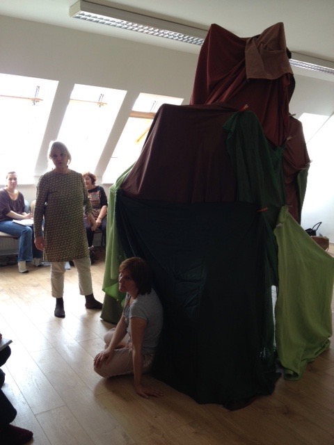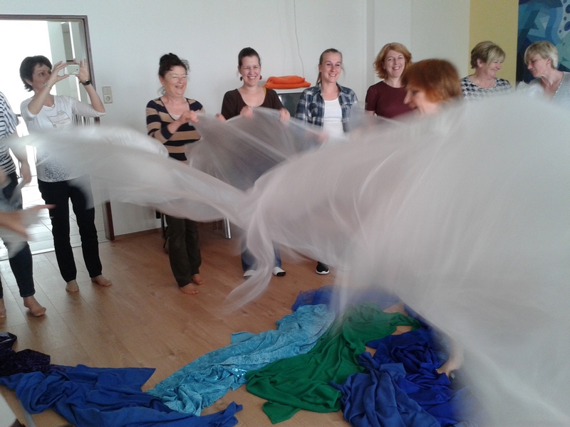 Man nehme zwei Tische, zwei Stühle, bunte Tücher und Wäscheklammern, und im Nu baut man ein Märchenschloss. In dieses kann man hineinschlüpfen, man kann es umgehen, besteigen, man kann seine Farben nennen, sogar ein Lied dazu singen – das stellte sich im Seminar, geleitet von den beiden Expertinnen aus Deutschland, heraus. Die Teilnehmerinnen erschufen aus den einfachsten Requisiten gemeinsam Phantasielandschaften für imaginäre Reisen und bauten Spielorte auf, die dann für kleine Rollenspiele, kreative Bewegung, Stilleübungen, Märchen und Geschichten genützt werden konnten.
