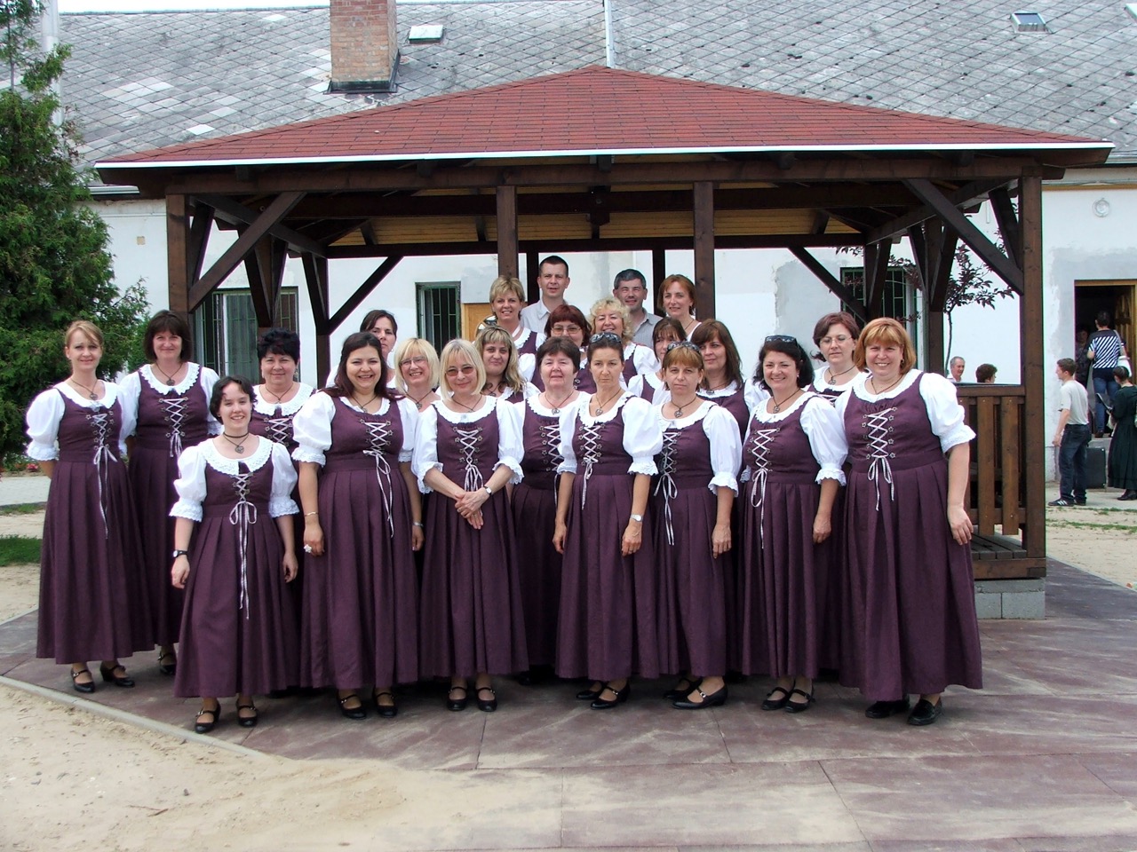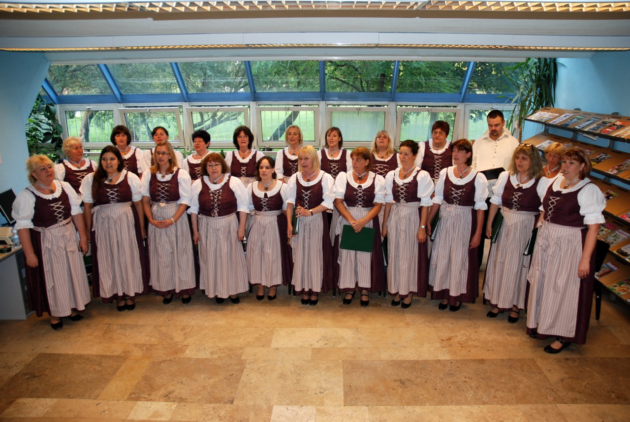 Die ersten ungarndeutschen Volkslieder, mit denen der Chor das Singen überhaupt begann, waren die Lieder, die auch von ihren Kindern in der Nationalitätenschule gesungen wurden. Ein Drittel des heute etwa 200 Lieder umfassenden Repertoires besteht weiterhin aus deutschen Volksliedern, die größtenteils in ungarndeutschen Dörfern gesammelte, teils bekannte, teils aber durch weitläufige und gründliche Forschungsarbeit der Chorleiterin neu entdeckte, schon fast völlig verschollene, kaum gesungene Lieder sind, wie zum Beispiel die der Sathmarer Schwaben. Die übrigen zwei Drittel des Repertoires beinhalten zwei-, drei- oder vierstimmige kirchliche und weltliche Chorwerke, wobei sowohl deutsche Madrigale und Motetten der Renaissance, als auch Werke berühmter und weniger bekannter deutscher Komponisten aus früheren Jahrhunderten gesungen werden.
