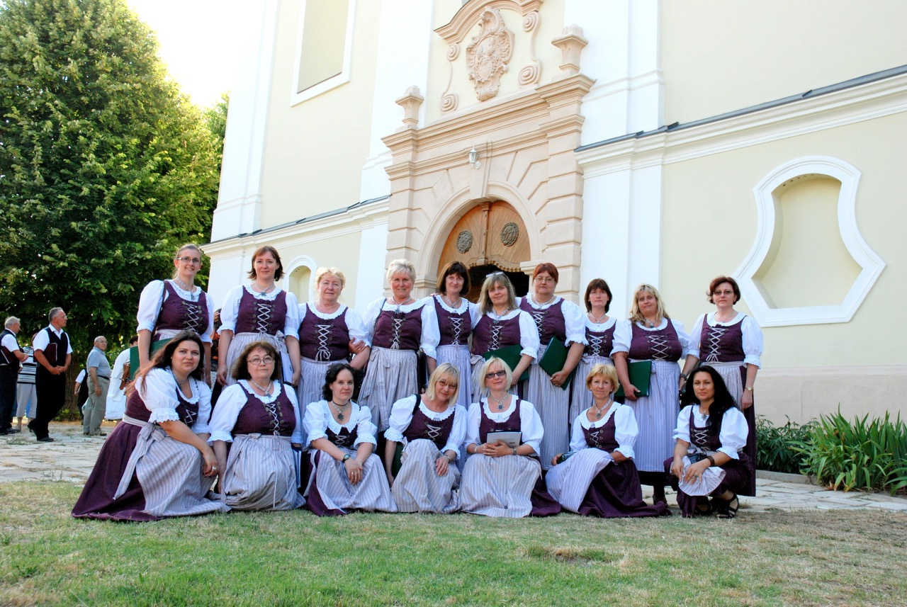 Der Glauben und alles was damit zusammenhängt spielt im Leben der Deutschen und genauso auch bei den Ungarndeutschen eine sehr wichtige Rolle. Der Liederschatz-Chor ist zwar kein Kirchenchor, aber es macht seit 2010 einen Teil unserer Traditionspflege aus, dass wir nun jedes Jahr in der Sankt-Ladislaus-Kirche in Pestszentlőrinc ein Adventskonzert geben, oft gemeinsam mit eingeladenen Gastchören. In derselben Kirche feierten wir im Mai 2011 das fünfte Jubiläum der Gründung, und zumal es in den Osterfeierkreis fiel, nahmen wir auch Osterlieder ins Programm auf. Dank der zahlreichen Auftritten an kirchlichen Feierlichkeiten haben wir 2013 Einladung bekommen zum damals schon zum 17-ten Mal veranstalteten jährlich stattfindenden Fest der ungarndeutschen Kirchenmusik. Auch in den darauffolgenden Jahren durften wir an diesem großartigen Fest teilnehmen, an dem so etwa 15 deutsche Chöre aus verschiedenen Gegenden des Landes die im Voraus ausgewählten und zugeschickt bekommenen, einzeln einstudierten Kirchenlieder dann beim Fest in Gruppen von je 3-4 Chören, und danach auch ein gemeinsames Lied vortragen. Ein erhebendes und bleibendes Erlebnis ist, wenn dann 3-400 Menschen im gemeinsamen Gesang Gott loben.