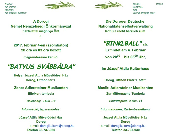 Schwabenball am 18. Februar um 18.30 Uhr im Hedjeßer Kulturhaus. Vor dem Ball gestalten die örtlichen Kindergarten- und Schulkinder, das Maratzer Ungarndeutsche Volkstanzensemble, die Tanzgruppe des Hedjeßer Ungarndeutschen Kulturvereins und der Vergissmeinnicht Chorein Kulturprogramm.