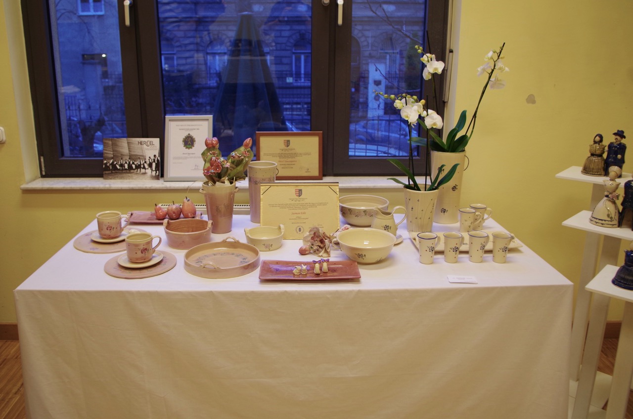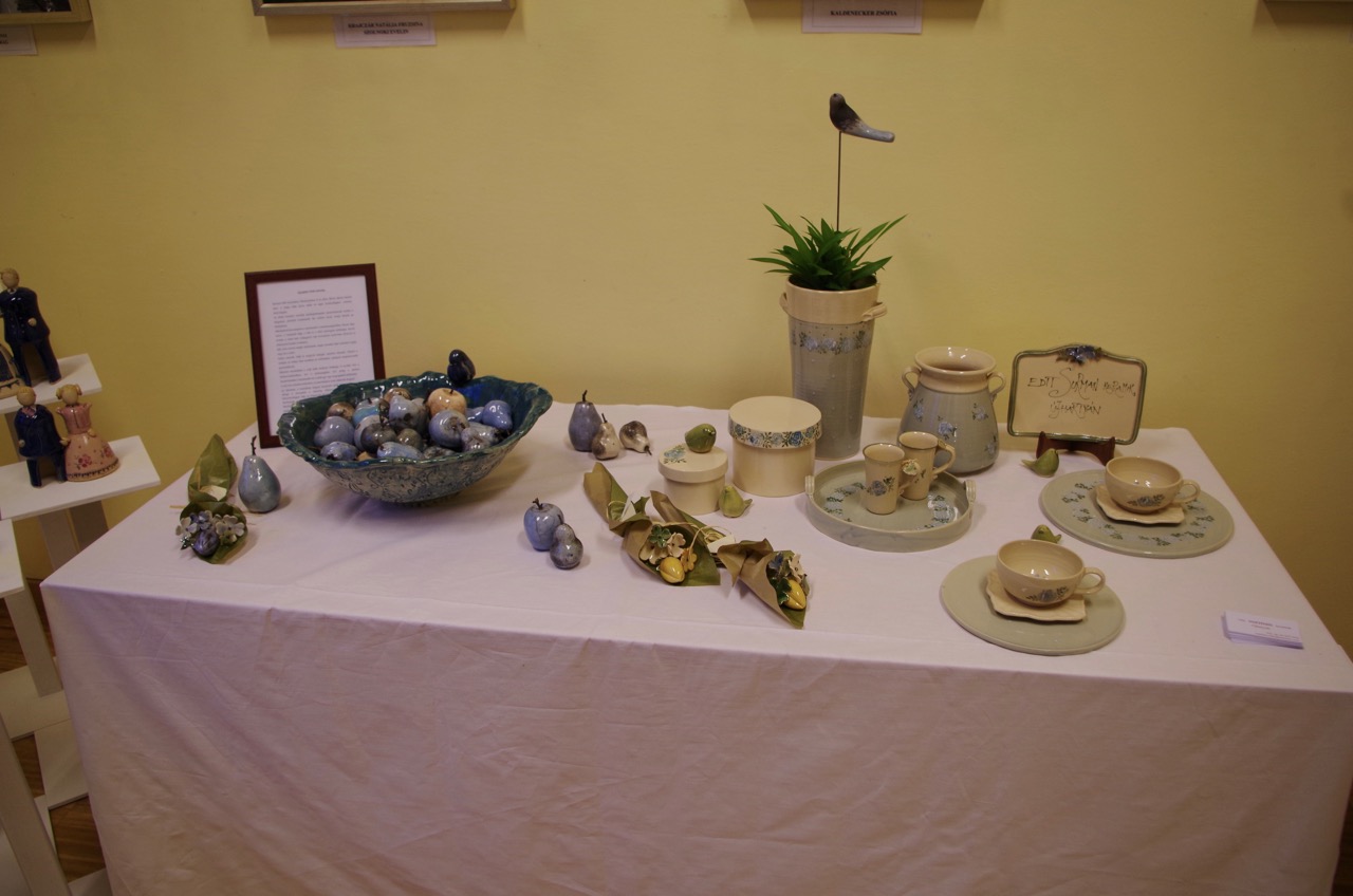 In der Ausstellung sind auch die Werke der Keramikerin Edit Surman zu sehen. Ihre Werke sind zwar alltägliche Gebrauchsgegenstände, aber in ihrer Art etwas Besonderes. Die weiche, milde Natur, der Lavendel und das harmonische Farbenspiel sind ihre Schutzmarke.