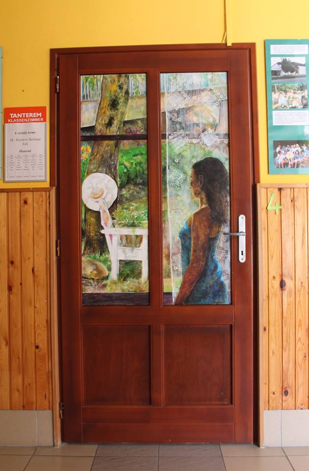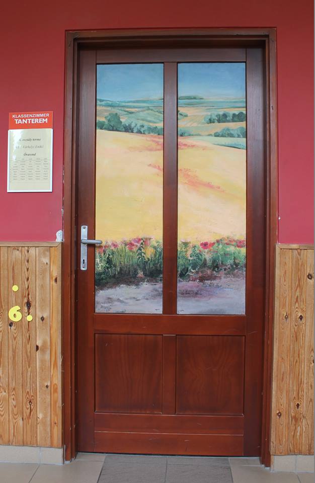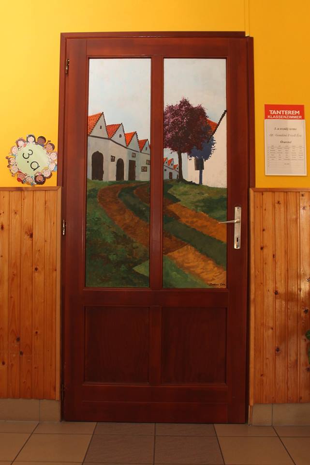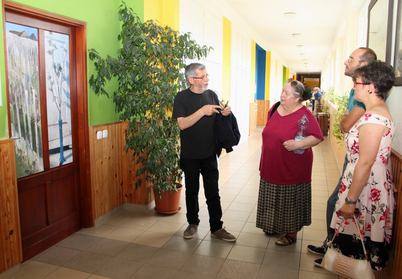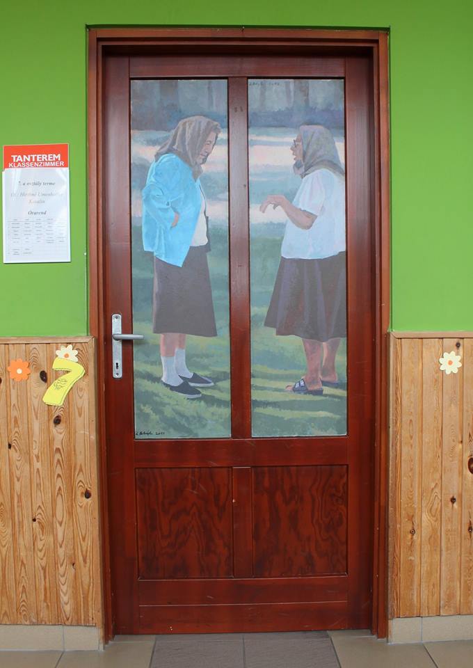 „Ich wäre froh, wenn die Kinder die Räumlichkeiten der Schule schon bald als Mohnblumen-, alte-Damen- oder Landschaftsbild-Raum bezeichnen würden”, meinte Albert Alföldi. Im Initiator und Leiter der Künstlerkolonie hätten immer individuelle, unregelmäßige und besondere Lösungen Spuren hinterlassen, darum habe er mit seinen Künstlerkollegen zusammen die Entscheidung getroffen, zum runden Jubiläum statt einer gewöhnlichen Publikation, oder statt der Einladung von Politikern lieber für die örtliche Gemeinschaft eine bleibende Nachricht zu hinterlassen: „Die konkrete Idee mit den Schultüren brachte Matteo Massagrande aus seiner Heimat mit sich. Der auch international anerkannte italienische Maler unterstützt als Mentor die Arbeit der aus Ungarn und Siebenbürgen nach Hajosch gekommenen Kunstschaffenden. Unser Lager ist übrigens wie eine Werkstatt der Renaissance: ein jeder befasst sich mit einem beliebigen Thema. Auch die Gesellschaft selbst ist sehr bunt, denn unsere jüngsten Mitglieder sind erst 14 Jahre alt, wobei die Älteste Teilnehmende – eine unserer Gründungsmitglieder – bereits 90 ist. All dem zu trotz bilden wir eine tolle Gemeinschaft, die an die einstigen schwäbischen Spinnstuben erinnert, wo von den kleinsten Kindern bis zu den Großeltern mehrere Generationen mit einander ihre Freizeit verbrachten.“