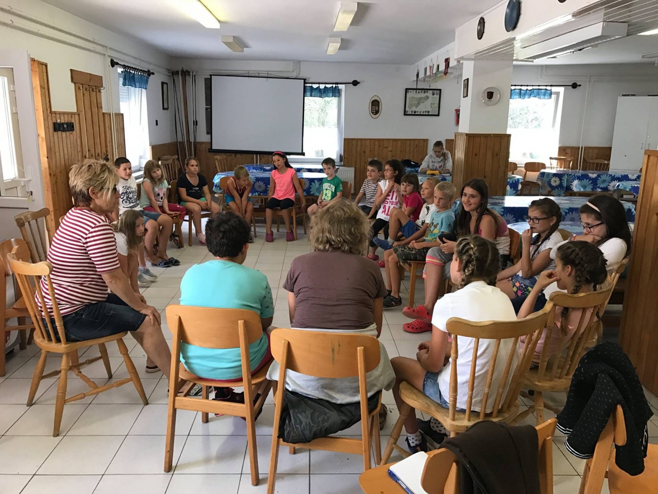 Das Tarianer Lager war ein idealer Ort für uns. Zwischen Bergen und Bäumen, wo neben den Häusern Hasen hüpfen, fühlten sich die Kinder wohl. Dieses friedliche Leben haben wir auch auf die Bühne genommen. Meine Schüler haben zusammen mit den kleinsten Kindern aus Pécs eine Szene aus dem Indianerleben vorgetragen. Sternreiter, Regenbogen, Lange Feder und die Anderen haben nachgewiesen, was der Sohn des Stammführers am Ende festgestellt hat: „Wie gut, dass wir in Frieden leben: Männer, Frauen, Kinder, alle zusammen!” Man kann sich keinen besseren Wunsch herausfinden.