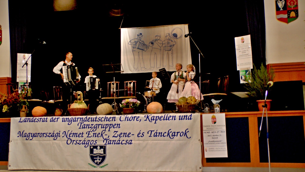 Ein Gründungsmitglied der „ungarndeutschen Familienmusiken” betrat nun die Bühne. Die Familienmusik Bauernhuber aus Herend. Der Vater Josef auf dem Akkordeon und die beiden Söhne Andor auf Klarinette und Ákos auf Tuba brachten uns nun folgende Stücke: Den „Brautwalzer aus Márkó“, „Hu-A-Hu Polka“, „Marichen saß weinend im Garten“ – einen Walzer, eine Volksliedbearbeitung, die „Herender Lieder“, „Ich geh so gern spazieren” – ein Volkslied (gesungen) und zum Abschluss die „Urlaubschein Polka“. Tosender Applaus war nicht nur ihnen sondern allen Familien als Dank gespendet.