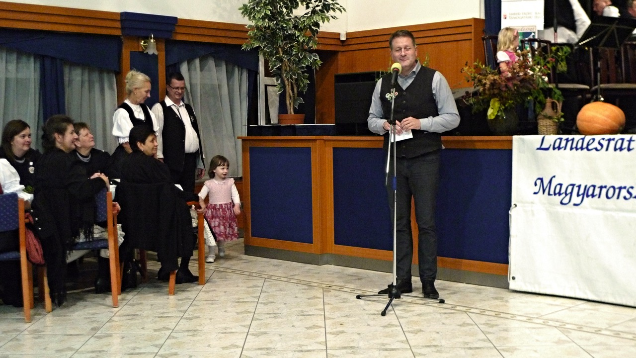Da der Chor Heimatklang aus Waschludt anwesend war, wurde die Gelegenheit genutzt, um mit dem Publikum einige traditionelle ungarndeutsche Volkslieder zu singen. Dafür wurde auch die musikalische Unterstützung der Bauernhubers gewonnen und so erklangen fröhliche Lieder, bevor der Protokollteil über die Bühne ging. Diesen nahm der Vorsitzende des Landesrates unterstützt von der Büroleiterin Zsuzsanna Ledenyi vor. In seiner Dankesrede, an die Familien und Alle, die hinter den Familien stehen, gerichtet, meinte er, dass die Jugend in den Familien der Garant für die Erhaltung unserer musikalischen Muttersprache sei. Jeder Familienvorstand bekam eine Erinnerungsurkunde und eine aus Ajkakristall gefertigte Kristallglocke, eingraviert mit dem Wappen des Landesrates und dem Name des Ereignisses.