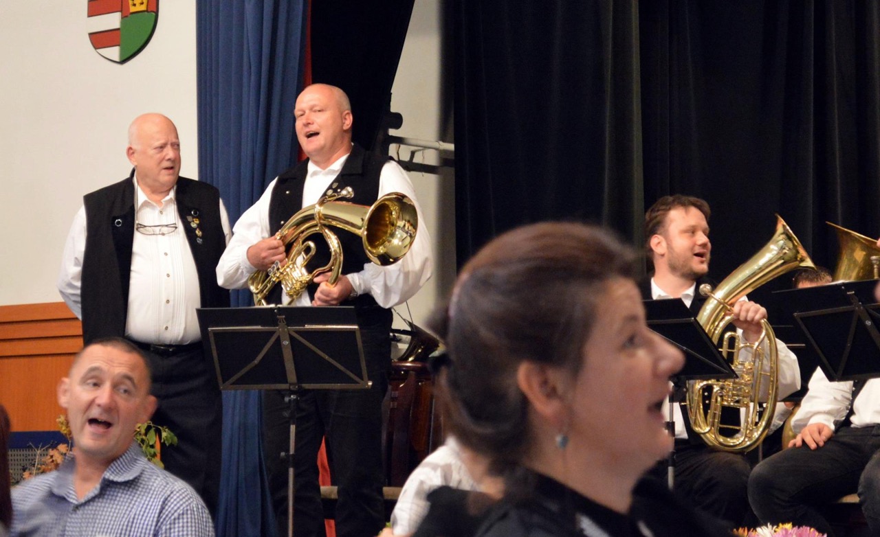 Nach Beendigung des offiziellen Teils wurde ein leckeres Abendessen serviert und das Publikum wurde von der Familienmusik Kaposi/Freude Kapelle zum Tanz gebeten. Was natürlich sehr gerne angenommen wurde. Auch die Bauernhubers wurden noch einmal tätig – im Solo, aber auch innerhalb der Freude Kapelle. Und sogar ein im Publikum anwesender Kapellmeister aus Werischwar (Johann Feldhoffer) griff zur Trompete uns spielte fleißig mit.