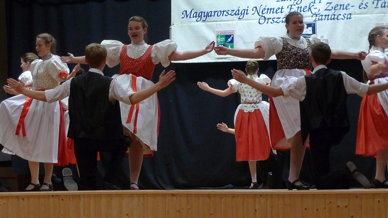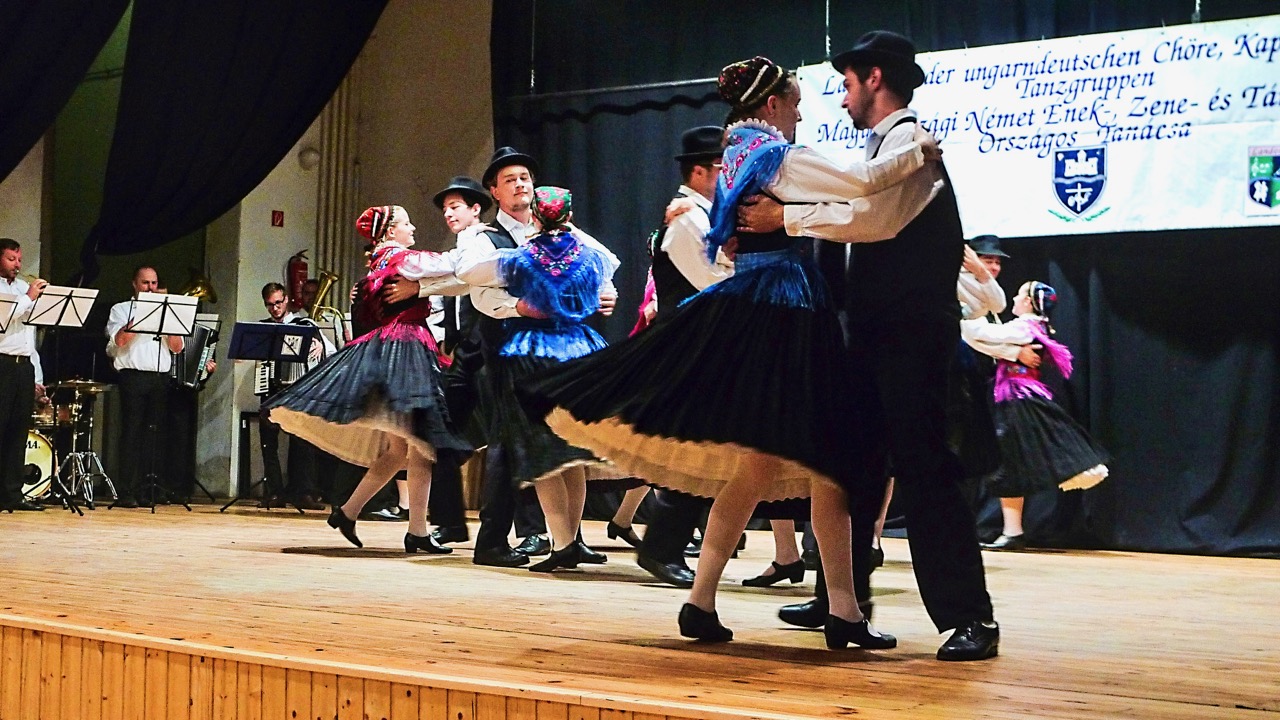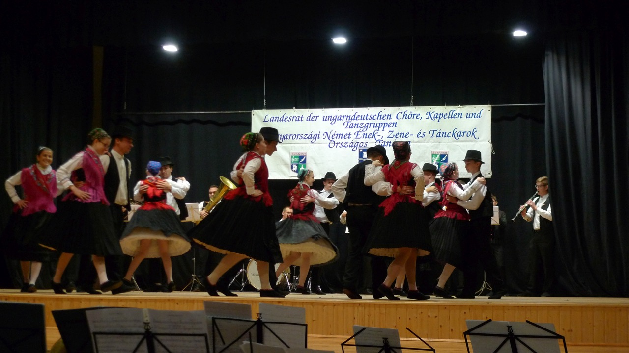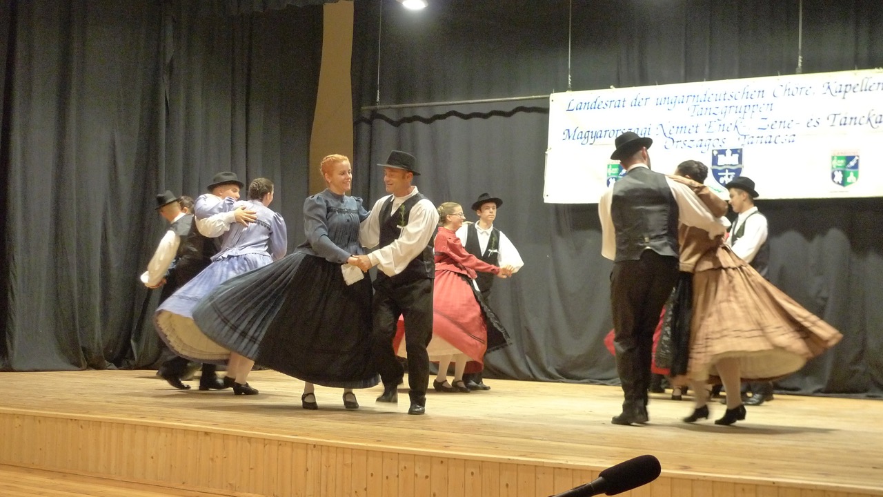Die Deutsche Nationalitätentanzgruppe aus Kier/Németkér, unter Leitung von Emil Hermann, war die nächste Gruppe, die wir erleben konnten. Mit einer neuen Choreographie in der Kategorie Volkstanz „Das Schöne Erbe/Szép örökség“ begeisterten die Tänzer das Publikum. Der Choreograph ist Emil Hermann. Begleitet wurde die Tanzgruppe von der Blaskapelle Roger Schilling unter Josef Fricz.