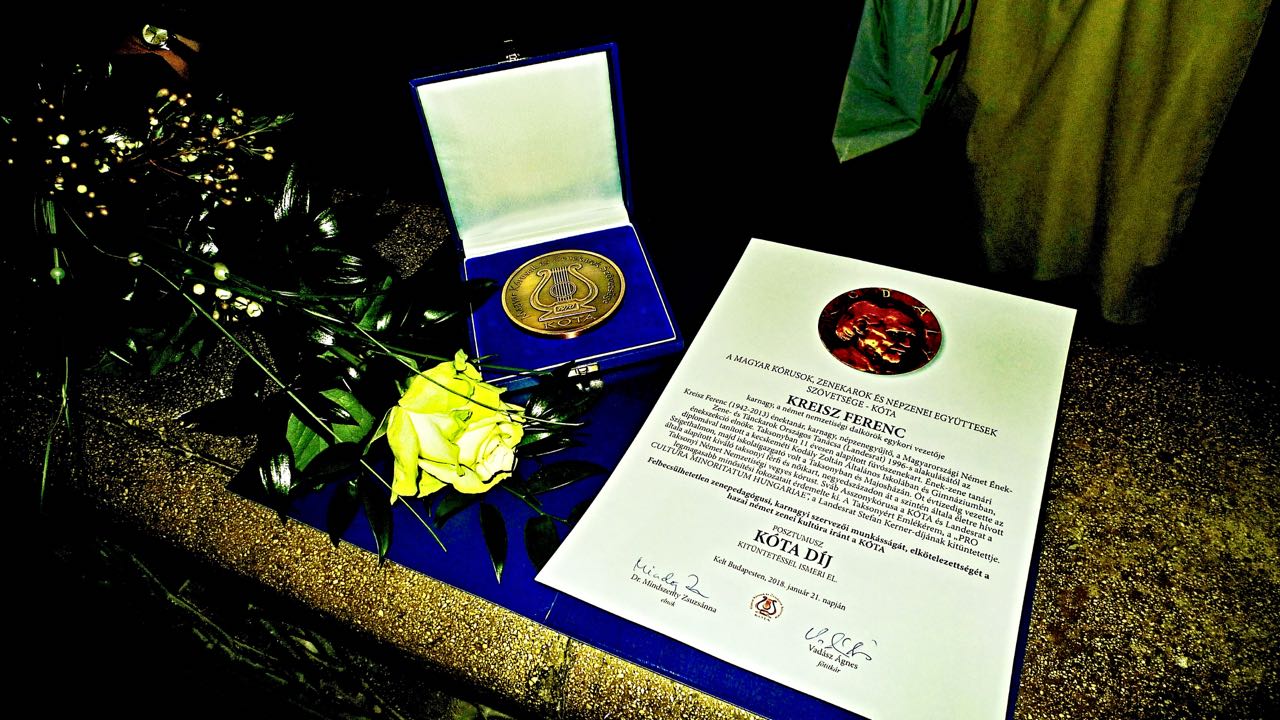 Die Auszeichnung wurde von József Birinyi, dem Mitvorsitzenden von KÓTA und Volksmusikforscher, mit warmen, anerkennenden und mitfühlenden Worten an Landesrat-Vorsitzenden László Kreisz, in Vertretung der Familie, überreicht.