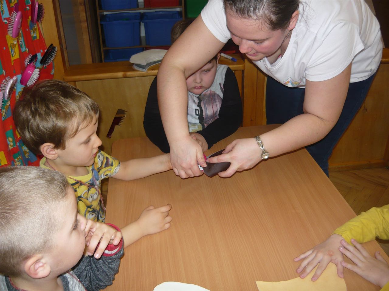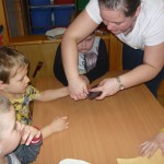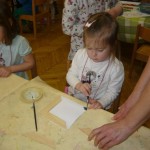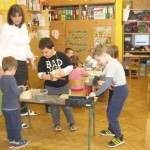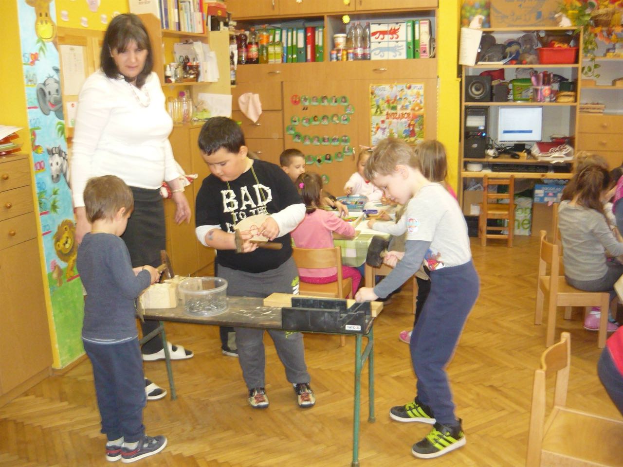 Vom 19. bis 23. März lautete das Thema: „Alte Berufe – Tischler, Schuster, Drucker und (da wir in Wetschesch sind) – der Sauer“. Die Woche beginnen die vier Gruppen immer zusammen. So können die Themen besprochen werden, und die Kinder erfahren, was in der Woche vorgehen wird. Sie singen und tragen dazu passende Lieder und Reimen vor. In Gruppen haben sie mit dem jeweiligen Beruf zusammenhängende Gesellschaftsspiele gespielt und die verschiedenen Bezeichnungen geübt.