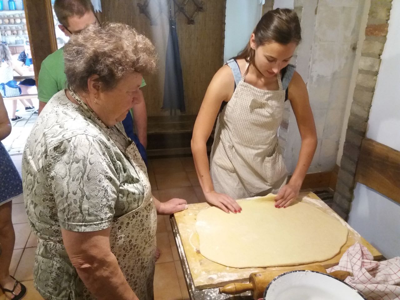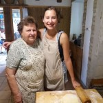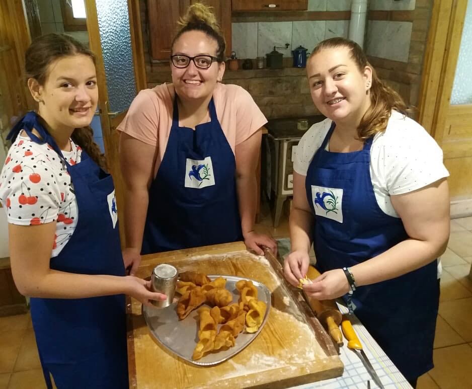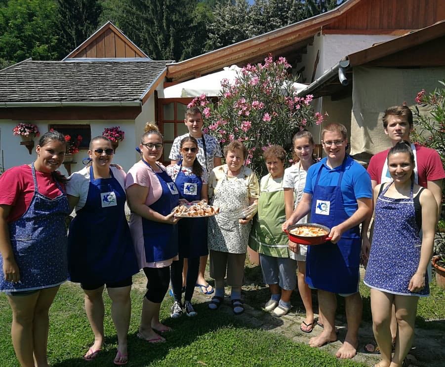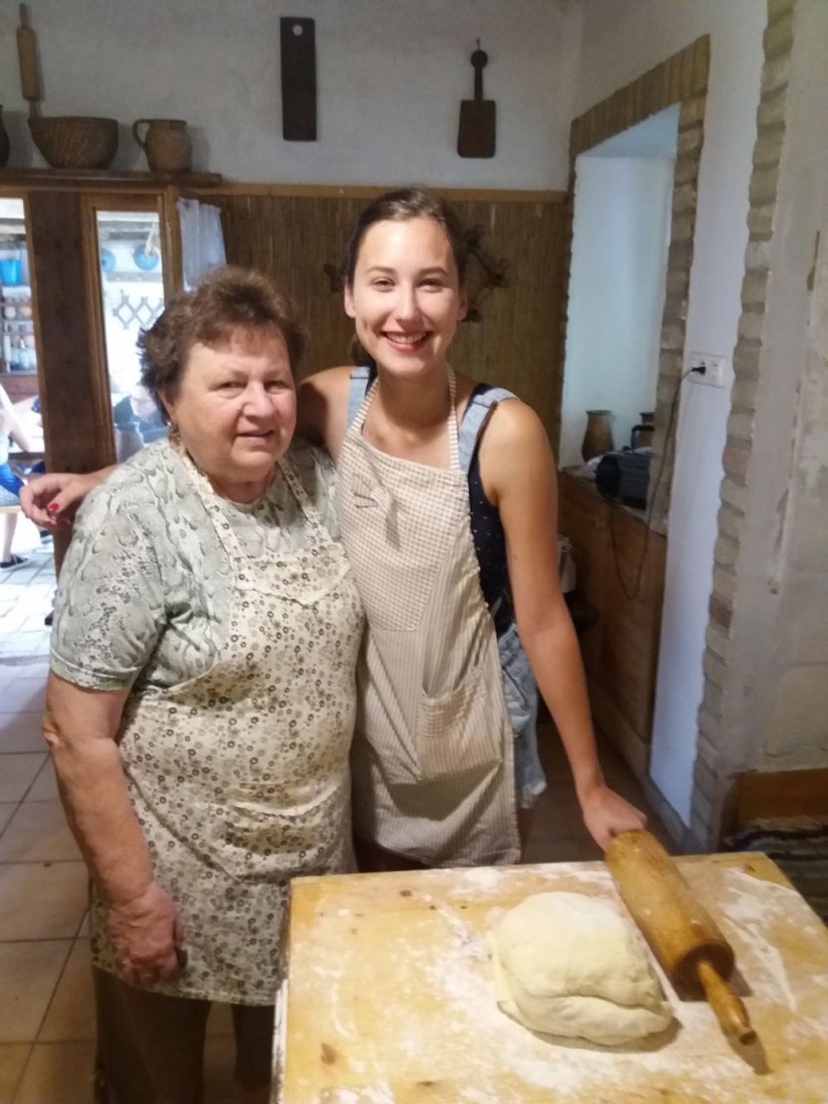 An jedem Vormittag bereiteten wir mit unseren Gastgebern, mit der Familie Markesz, eine Suppe, ein Hauptgericht und ein typisches Gebäck zu. Im Laufe der Woche machten wir zum Beispiel Kraut und Knedel, Ohrwaschl, Bohnensuppe mit Hefeknedl, Schmerkipfel und Strudel. Interessant war, dass wir doch viele Ähnlichkeiten mit unserer Gastronomie entdeckten. Viele Spezialitäten haben nur eine andere Bezeichnung – beispielsweise Ohrwaschl wird bei uns Zimetkrofni genannt -, oder wir fanden nur winzige Unterschiede in den Rezepten. Die Grundzüge sind also in den Küchen der beiden Ortschaften gleich, die Sparsamkeit und die Handlichkeit sind in den Vordergrund gestellt, es gibt nur wenige Fleischgerichte, Gemüse wie Bohne, Kraut, Tomate werden besonders häufig und gerne aufgearbeitet. Frau Kathi und Resi waren immer sehr hilfsbereit und nett zu uns, sie brachten uns Vieles bei. Die Mädchen wurden öfters gelobt, weil sie geschickt und selbstständig arbeiteten, sie hatten in Hartian gute Grundlagen bekommen.