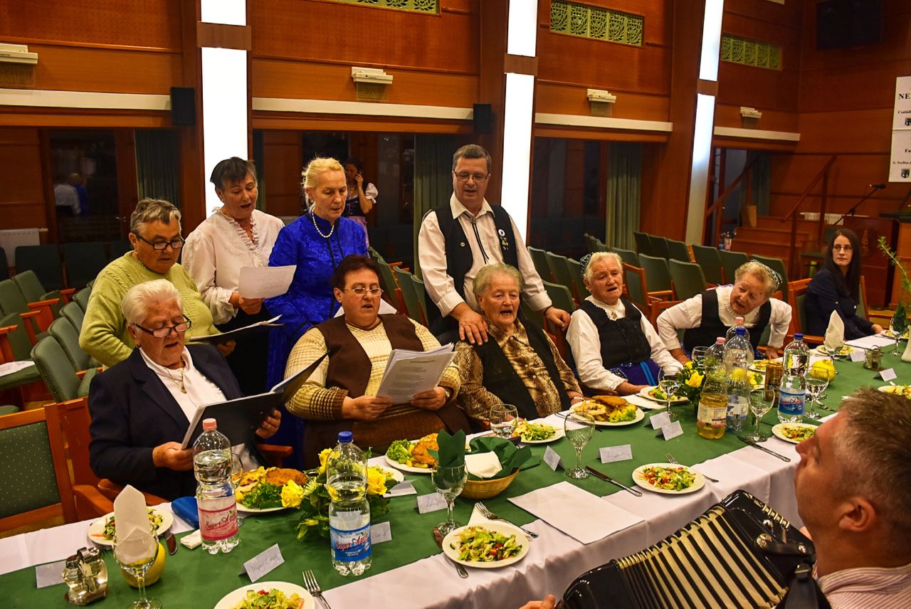 Darauf wurden die Gäste gebeten gemeinsam mit den anwesenden Chören ungarndeutsche Volkslieder zu singen. Dazu wurden die Texte auf den Tischen gelegt und jeder konnte mit mehr oder weniger Stimme mitsingen.