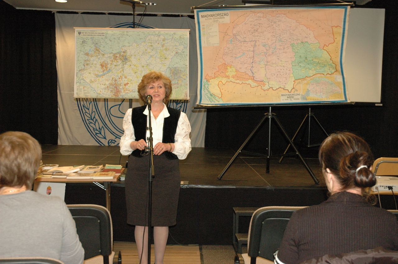 Viktória Kishegyi, Kulturhistorikerin, Leitende Oberrätin des Ungarischen Parlaments in Ruhestand, leitete die Anwesenden in die Geschichte und Traditionen der Ungarndeutschen ein, mit besonderer Hinsicht auf das Schicksal des Deutschtums in der Umgebung von Ofen und Pesth. Sie distanzierte sich von der Tätigkeit des Volksbundes, dessen Folge für die Ungarndeutschen die Kollektivschuld, die Vertreibung und Verschleppung zu „Malenkij Robot“ war. „Wir waren und sind immer noch dankbare Bürger, nebst der Identitätsbewahrung betrachten wir Ungarn als unsere Heimat“, betonte sie und legte einen Koffer voll mit Büchern auf den Tisch, damit man sie als Quelle für die Geschichtsforschung der Ungarndeutschen nimmt. Als Kuriosum galt, dass man im Sozialismus die DDR als Mutterland betrachten musste. In den 70-er Jahren wurden Forscher aus der DDR nach Ungarn geschickt, so sammelten Axel Hesse Volkslieder und Kurt Petermann Volkstänze. Am Nachmittag wurde aus dieser Sammlung eine Aufnahme gezeigt, eine Mazurka von der Tschepele-Insel.