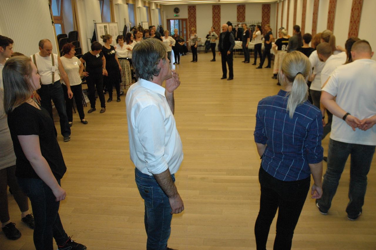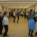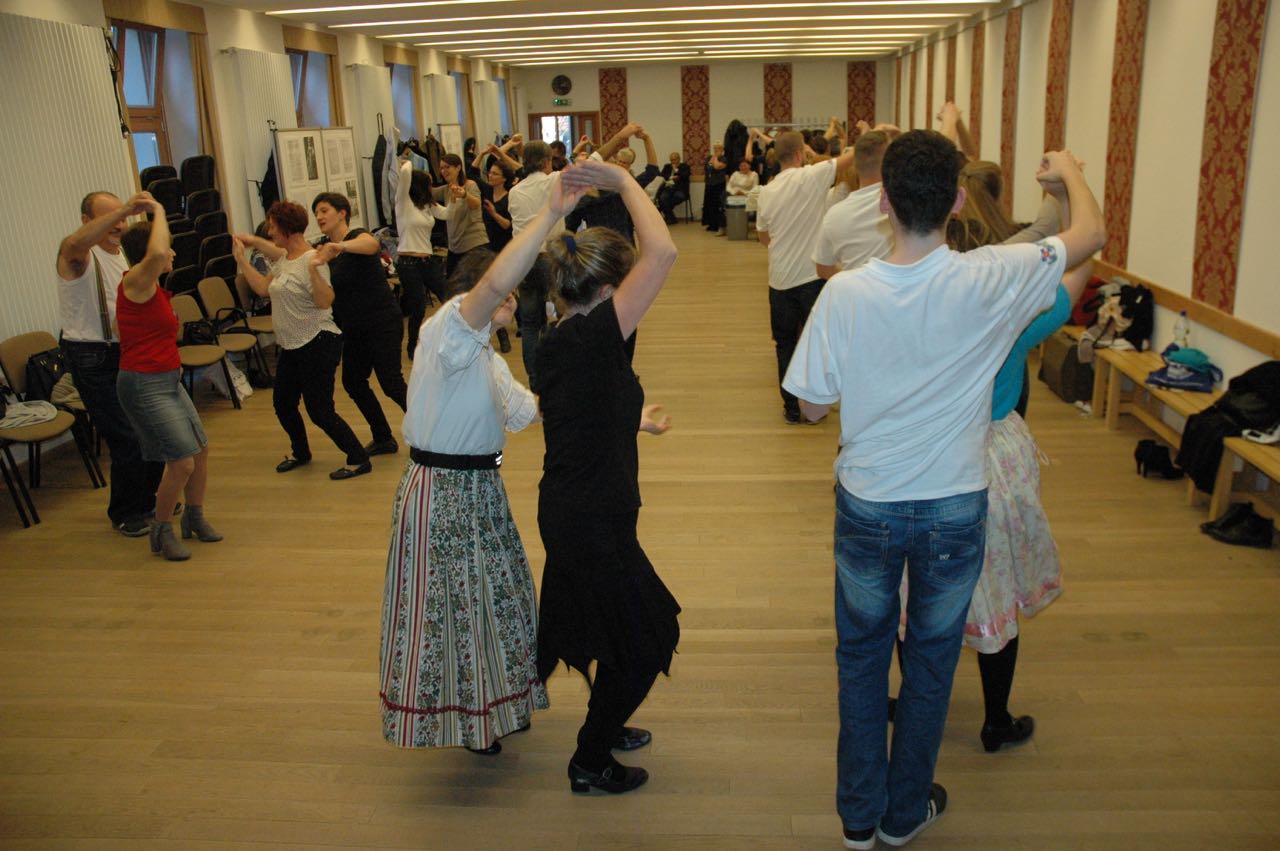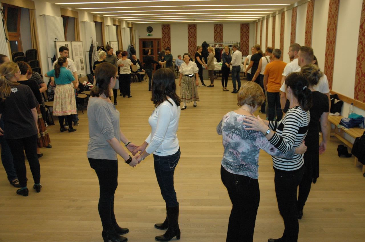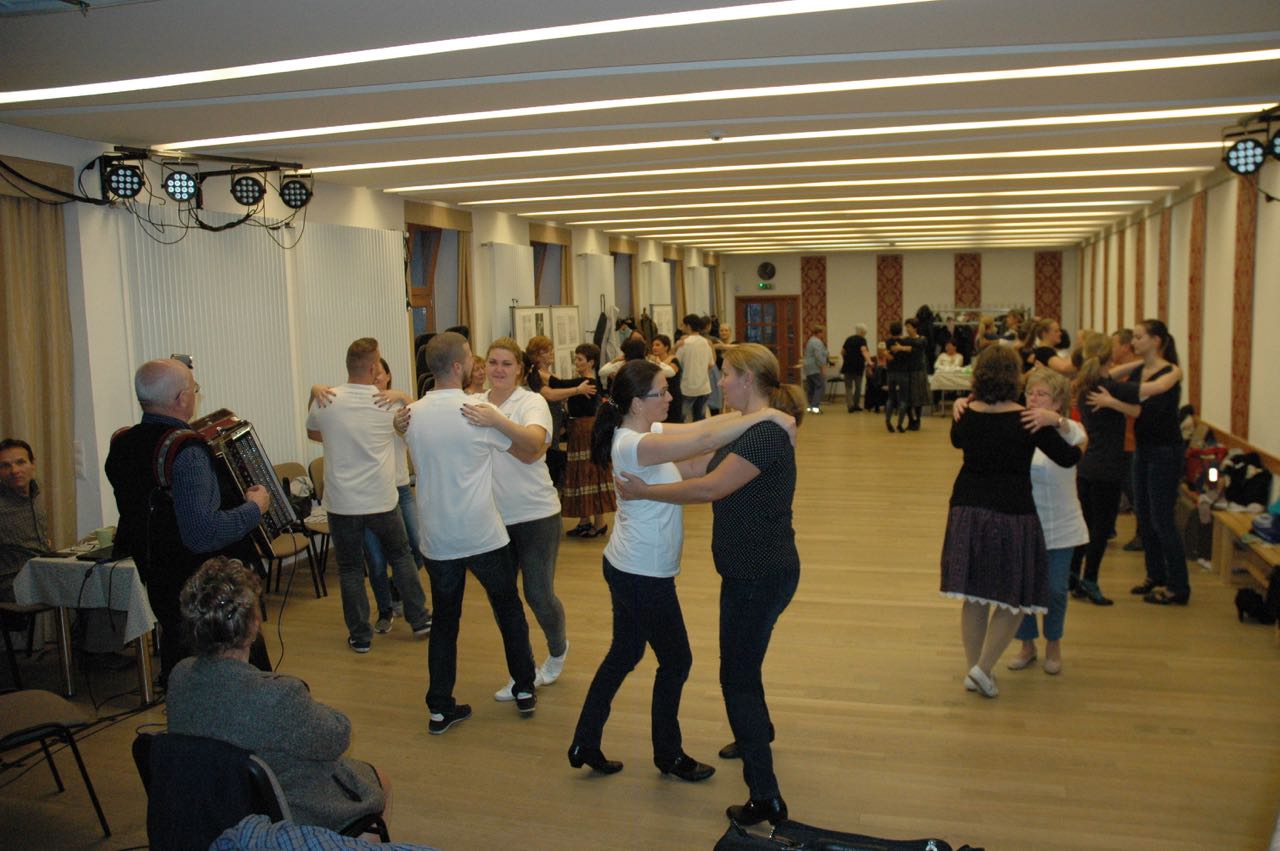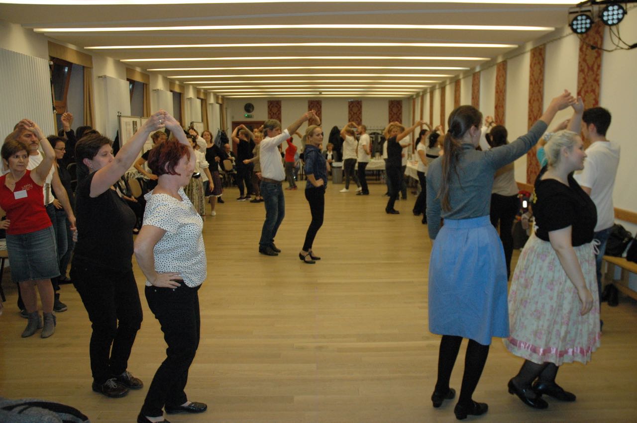 Nach dem feinen Mittagessen kamen die Aufwärmeübungen und der Tanzunterricht. László Nagy brachte Polkavarianten aus Maratz, Simon Kishegyi jun. Polkavarianten aus Nadwar und Ländlervarianten bei. Zum Schluss zeigte Ildikó Szeltner-Winhardt Tanzschritte der Mazurka von der Tschepele-Insel anhand der Sammlung von Kurt Petermann. Simon Kishegyi jun. spielte die Tanzmusik auf Akkordeon dazu.