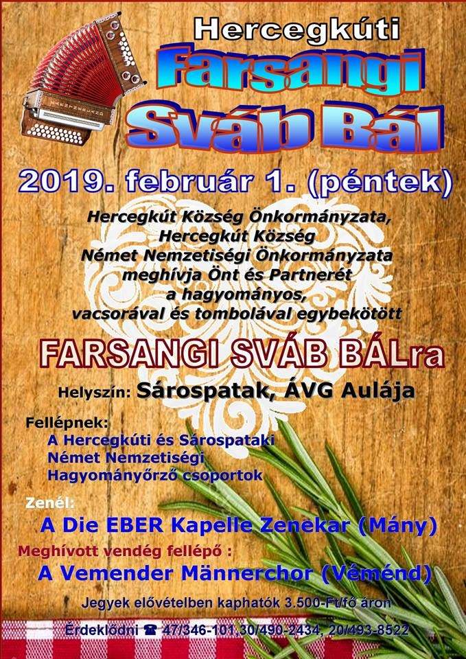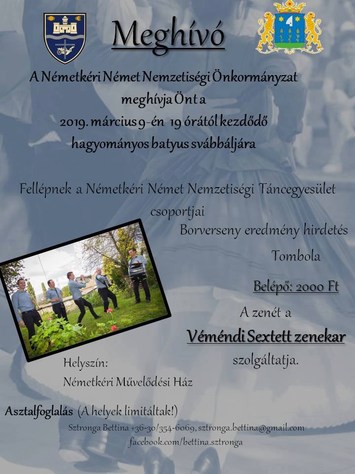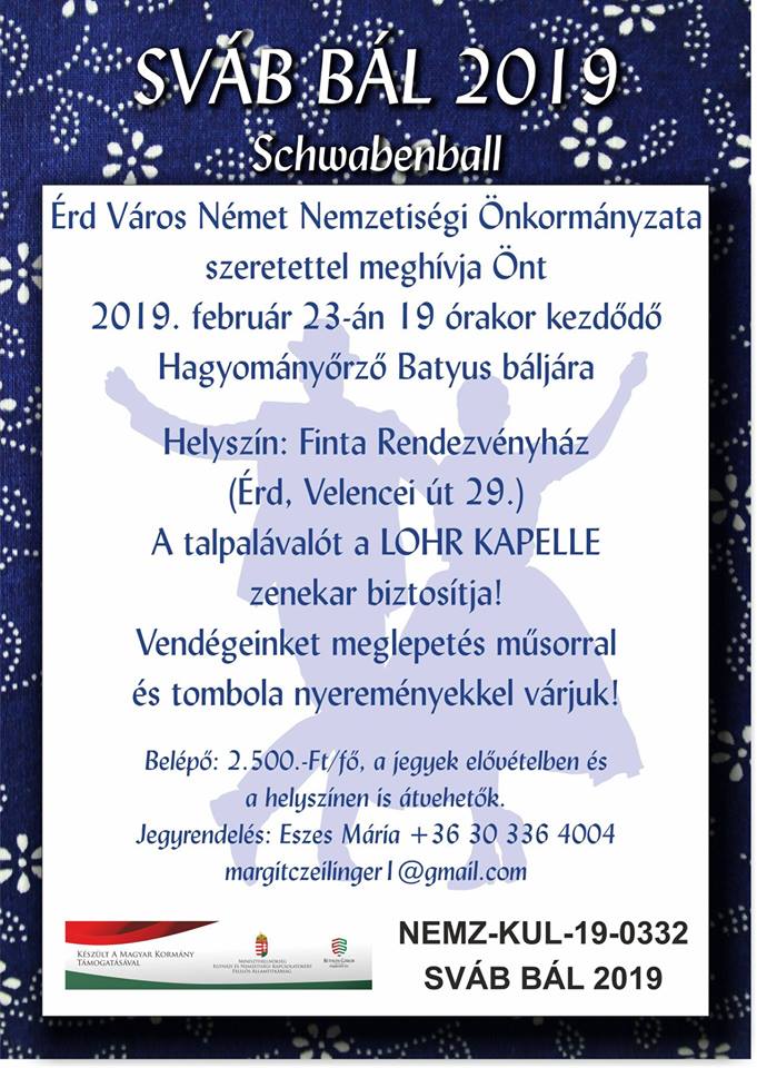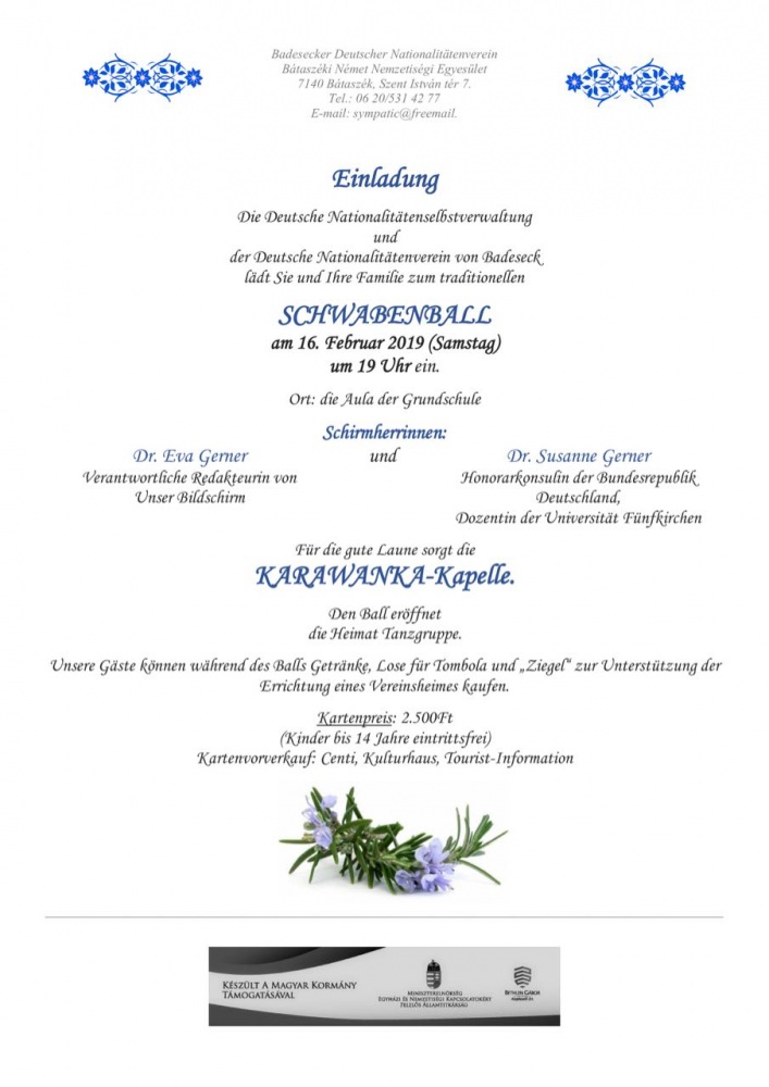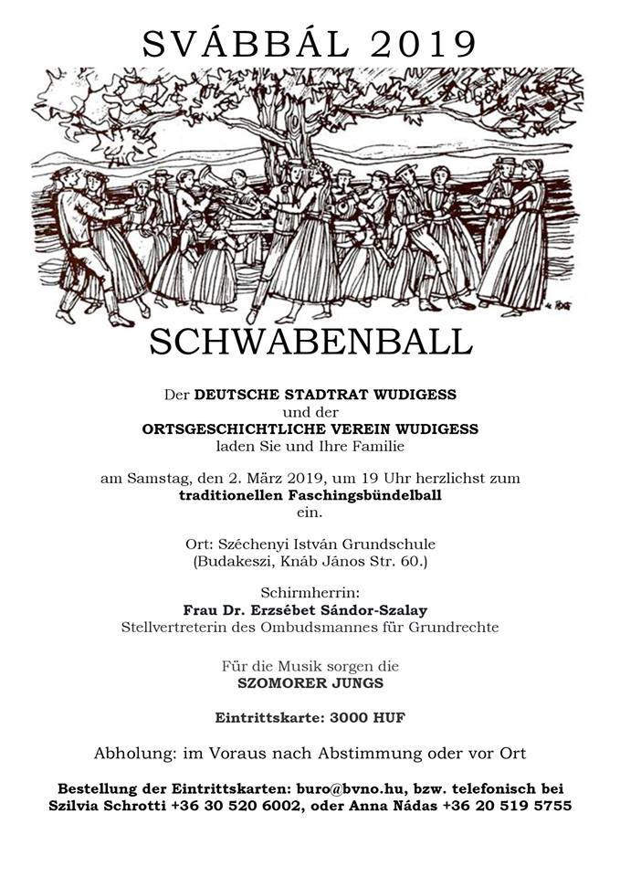 Die Deutsche Selbstverwaltung Neupesth lädt alle Interessenten zum Schwabenball am 16. Februar 2019 um 17 Uhr im Bürgerzentrum (1043 Budapest, Árpád út 66.) ein.