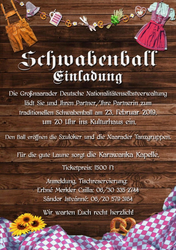 Die Deutsche Nationalitätenselbstverwaltung von Großnaarad organisiert am 23. Februar ab 20 Uhr im Kulturhaus einen Schwabenball. Für die gute Stimmung sorgt die Karawanka-Band.