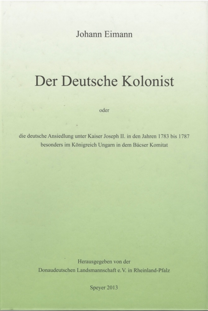 Johann Eimanns Bericht Der Deutsche Kolonist über die Ansiedlung der Deutschen in Neu-Siwatz (Újszivác) und deren Umgebung ist eine unersetzliche zeitgenössische Quelle und so eine der wertvollsten Dokumentationen aus dieser Zeit, die der Nachwelt erhalten blieb. Die von der Donaudeutschen Landsmannschaft e. V. im Jahre 2013 in Speyer herausgegebene 5. Auflage beinhaltet aber nicht nur das ursprüngliche, zuerst im Jahre 1822 in Frakturschrift ausgedruckte Werk.