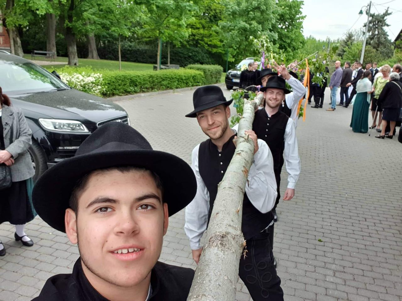 Der Maibaum hat – wie auch das Gedicht beschreibt – eine ganz komplexe Symbolik. Er ist ein wichtiges Symbol der Liebe, er bedeutet ebenfalls die Wiedergeburt der Natur, den Sieg des Frühlings über den Winter oder man kann ihn auch mit dem Baum des Lebens assoziieren. Eben deshalb hatte der Maibaum in unserer Kultur einen hohen Stellenwert und ist das Maibaumstellen nicht nur für einige Ortschaften charakteristisch. Es ist in dem süddeutschen Gebiet fast überall verbreitet und bekannt. Auch bei uns Ungarndeutschen wird dieser Brauch bis heute in vielen Ortschaften eifrig gepflegt. Jetzt kommen zwei Beispiele, das eine aus Harast/Dunaharaszti und das andere aus meinem Heimatort Hartian/Újhartyán.