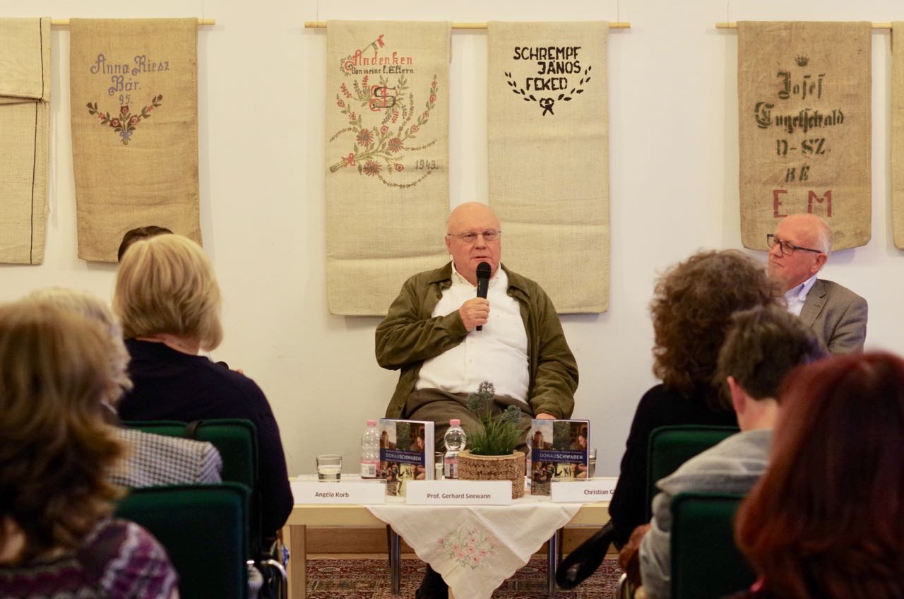Prof. Seewann wurde unter anderem über seine Forschungsmotivation und sein Forschungsfeld befragt. Der Anreiz, seine Forschung auf die Minderheiten zu fokussieren, war eine Studienreise im Jahre 1968 nach Temeswar, wo er das multikulturelle und friedliche Zusammenleben verschiedener Nationalitäten erlebte. Der aus Graz stammende Historiker war in München am Südost-Institut mit dem Forschungsfeld Ungarn tätig. Er erwarb schon 1974 ein Forschungsstipendium nach Ungarn zu kommen, um die Ungarndeutschen zu erforschen. Diesbezüglich hob er hervor, wie wichtig es sei, bei den Forschungen vor Ort zu sein, und dass er auch viel vom Ethnografen Bertalan Andrásfalvy gelernt habe. Zwischen 2007 und 2015 leitete er der Stiftungslehrstuhl für Deutsche Geschichte und Kultur im südöstlichen Mitteleuropa an der Universität Pécs/Fünfkirchen.