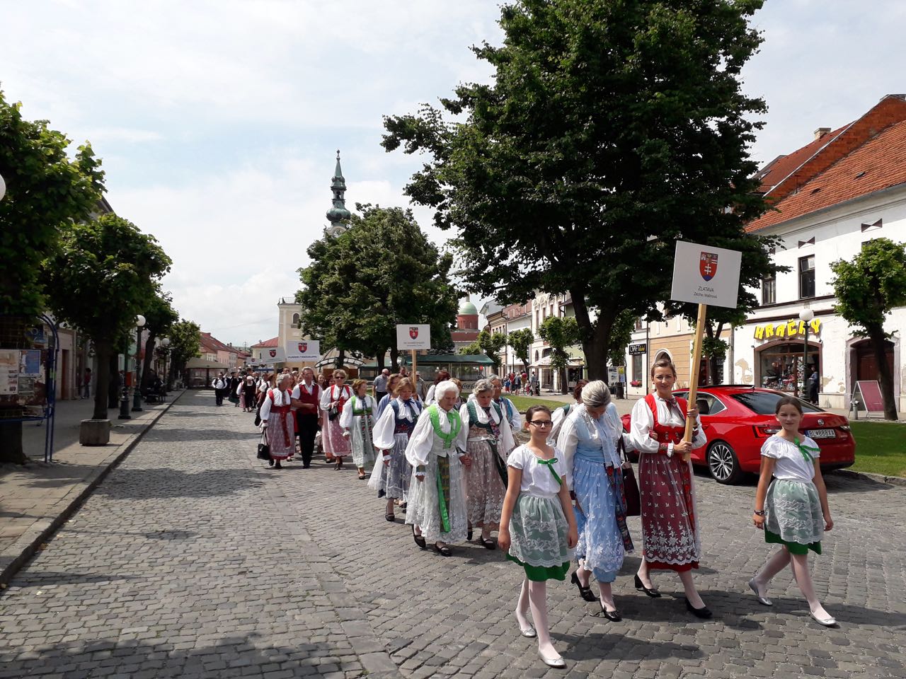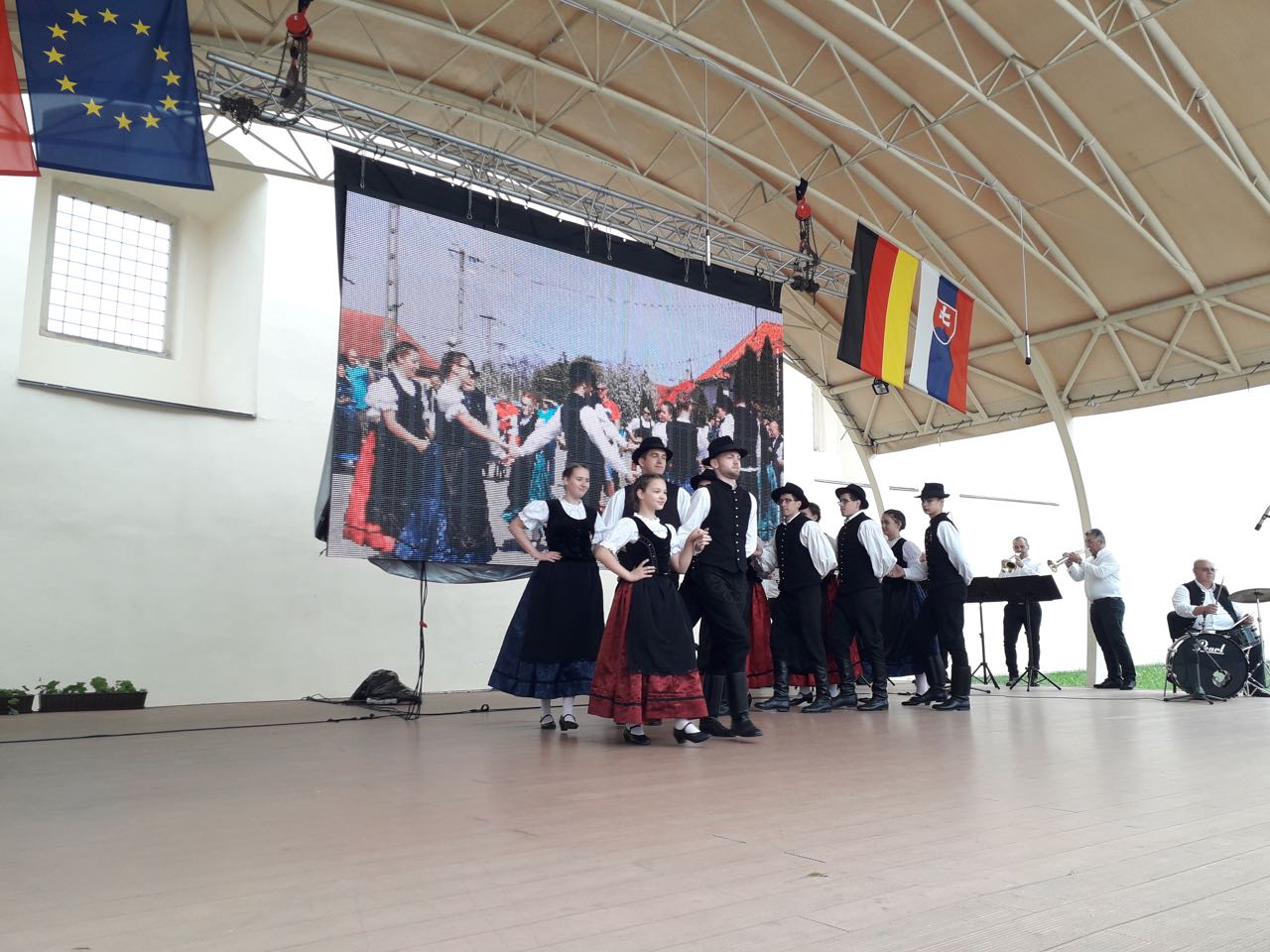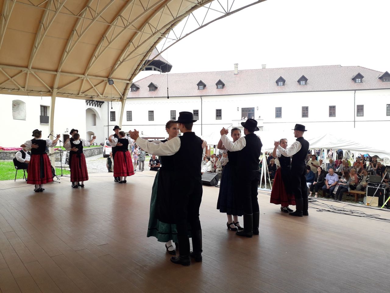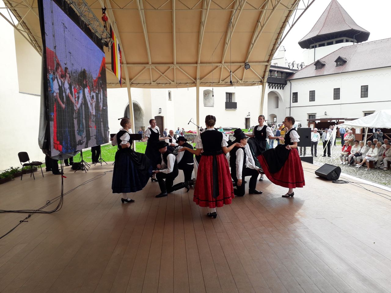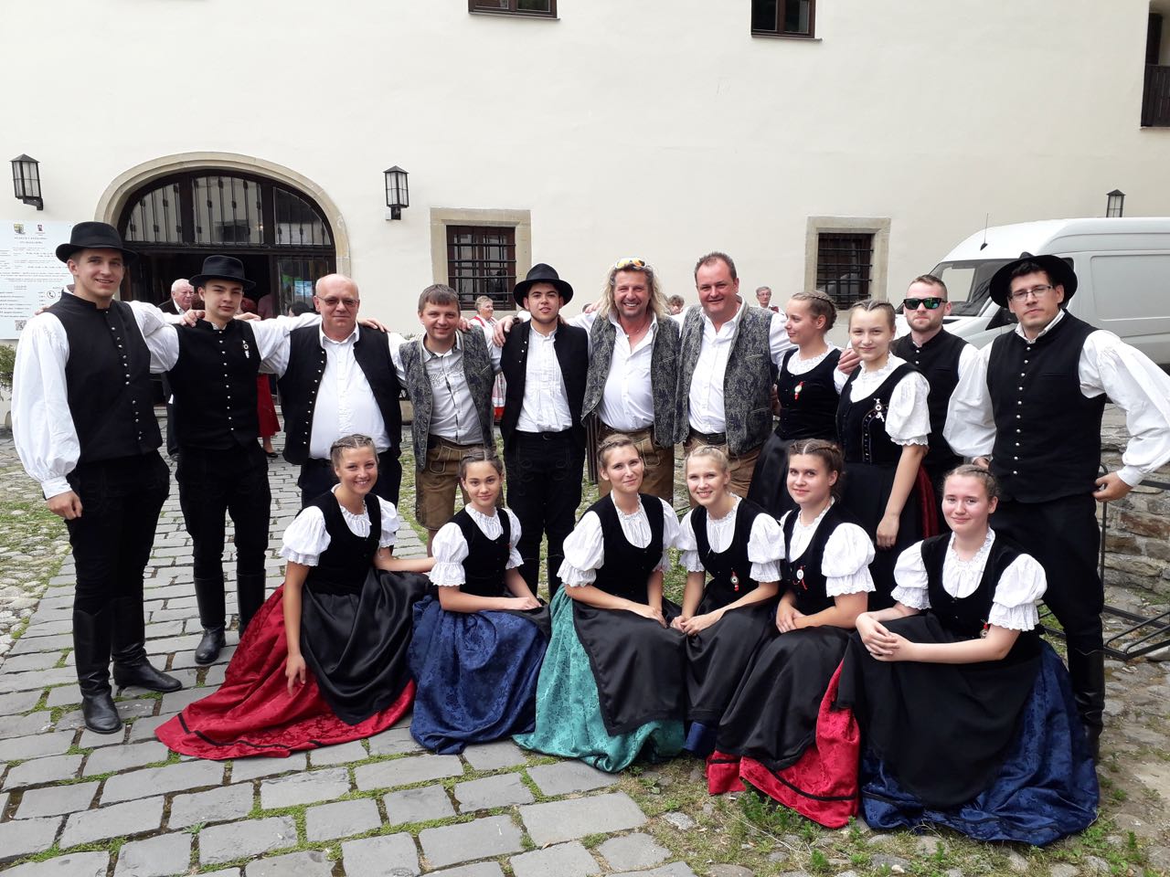 Das großangelegte Kulturfest der Karpatendeutschen begann mit einem deutschsprachigen ökumenischen Gottesdienst in der wunderschönen Käsmarker evangelischen Holzkirche, nach der Andacht ging der spektakuläre Aufmarsch der Trachtengruppen zur Burg Thököly, die als stimmungsvoller Schauplatz des Kulturprogramms diente. Am Nachmittag konnten wir eine breite Palette von verschiedenen Ensembles bewundern, die aus den verschiedenen historisch deutschgeprägten Regionen der Slowakei z. B. aus der Ober- und Unterzips, aus dem Hauerland oder aus Pressburg nach Käsmark kamen, das immer als eine Hochburg der Zipser Sachsen galt. Es herrschte hervorragende familiäre Atmosphäre, es war schön schon bekannte Gesichter wiederzusehen, gute Gespräche zu führen und natürlich neue Bekanntschaften zu knüpfen. Das Programm endete mit dem Auftritt der Haraster Jugendtanzgruppe mit der Begleitung der Haraster Dorfmusik unter der Leitung von Andreas Zwick. Die Haraster Vorstellung erntete riesigen Beifall, man konnte in diesen Minuten noch stolzer auf ihre ungarndeutsche Abstammung sein. Wir bekamen sehr viele lobende Worte. Es freut uns, dass wir zum hohen Niveau der Veranstaltung beitragen konnten.