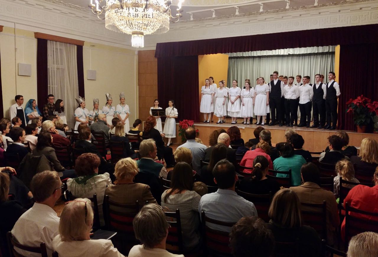 Als kleine Überraschung bereiteten sich die Zweitklässler der Grundschule Pannonia aus dem XIII. Bezirk mit einem Tanzauftritt vor, der dank der liebevollen Aufführung mit Spiel und Lustigkeit erfüllt war. Auch die SchülerInnen des Deutschen Nationalitätengymnasiums stellten ein buntes Programm zusammen. Es wurden Auszüge aus dem Text von Valeria Koch Wo die Schlitten sausen rezitiert, Weihnachtslieder gesungen, aber auch ein Krippenspiel vorgeführt. Als Abschluss brachte der Rosmarin-Chor aus dem XVI. Bezirk einen Liederkranz mit Weihnachts- und ungarndeutschen Stücken.