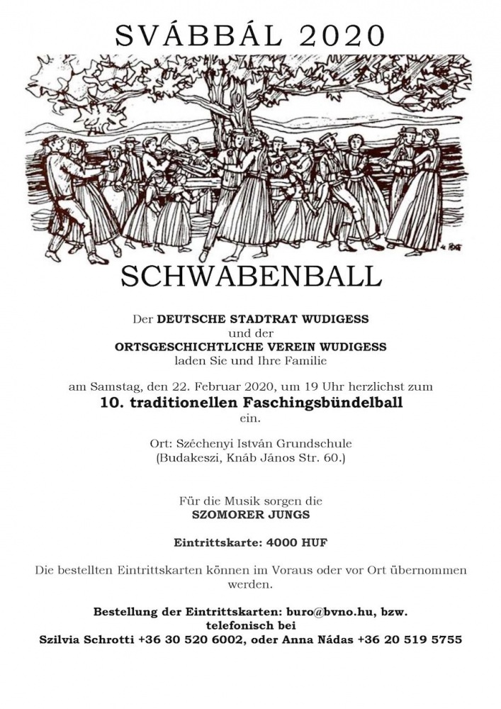 Der Schwabenball des Ungarndeutschen Bildungszentrums Baje findet am 1. Februar statt. Auf dem Ball präsentieren die Tanzgruppen des UBZ und die Fünfkirchen-Leőwey Tanzgruppe ihr Können, für die gute Stimmung sorgt die Kapelle „Ungarndeutsche Jungs”.