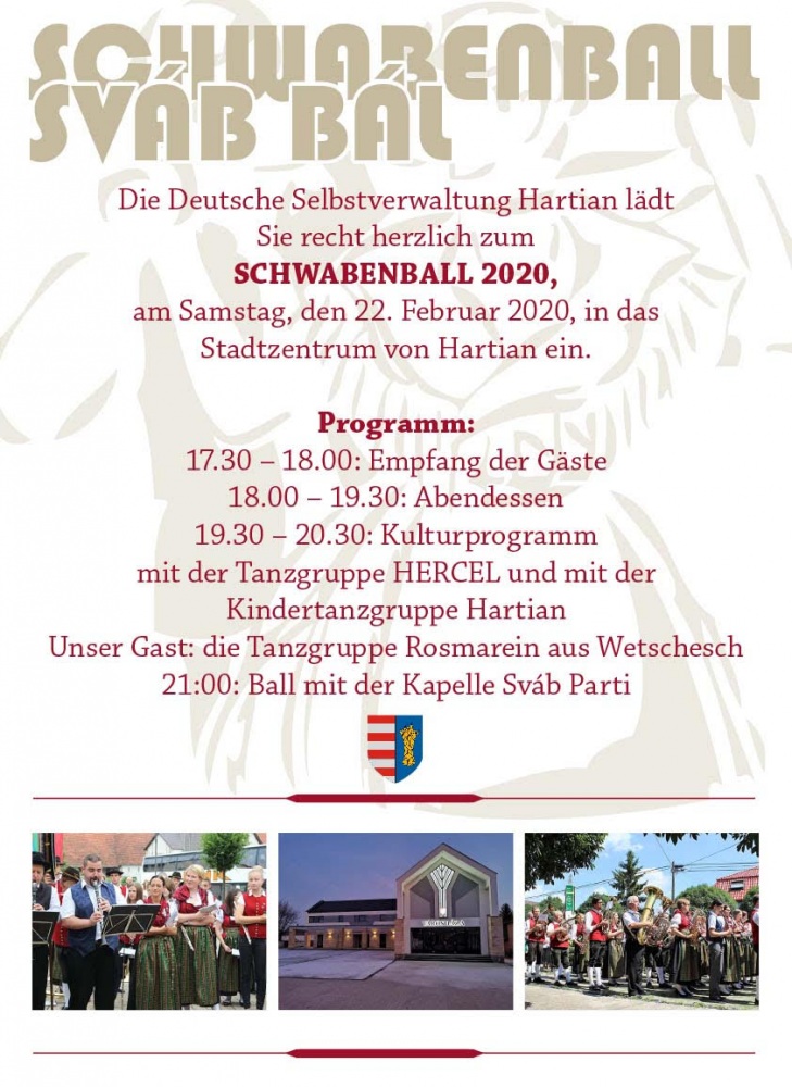 Die Deutsche Selbstverwaltung Hartian lädt Sie recht herzlich zum Schwabenball 2020, am Samstag, den 22. Februar, in das Stadtzentrum von Hartian (Hősök tere 4, Újhartyán) ein.