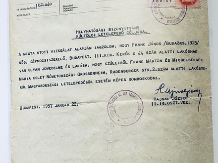 Ansiedlungsgenehmigung für einen Ausländer. Budapest, 22. Januar 1956