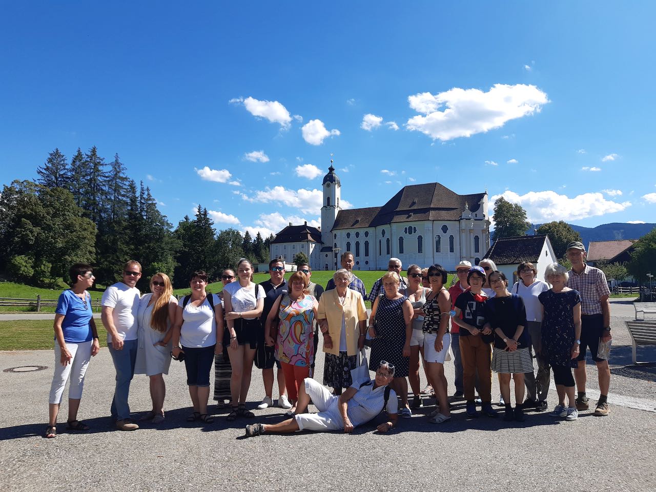 Dank Pfarrer Sauer verbrachten also diesmal dreizehn Personen von der Bonnharder Seite sowie zwölf Personen aus Bad Ragaz ein angenehmes Wochenende im sog. Pfaffenwinkel. Das Programm bekam zutreffend den Namen „Freizeit“. Ich hatte auch das Glück, mit dabei zu sein und die Entstehung einer hoffentlich noch lang währenden Freundschaft zu verfolgen. Der Pfaffenwinkel ist wie sein Name auch andeutet (wurde lateinisch auch „‚Ecke der Mönche“ genannt) vor allem für seine prächtigen Wallfahrtskirchen und Klöster im Barock- und Rokokostil bekannt. Das Hauptprogramm bildeten die Besuche dieser einzigartig schönen religiösen Denkmäler in der Umgebung von Steingaden. Wir besichtigten unter anderem die Klosterkirche Rottenbuch, das Welfenmünster in Steingaden und die deutschlandweit berühmte Wieskirche, die sogar auf der Liste des UNESCO-Welterbes steht. Außerdem besuchten wir noch Sehenswürdigkeiten wie die Passionsspielstadt Oberammergau, das Ettaler Benediktinerkloster und das Schloss Linderhof von König Ludwig II.