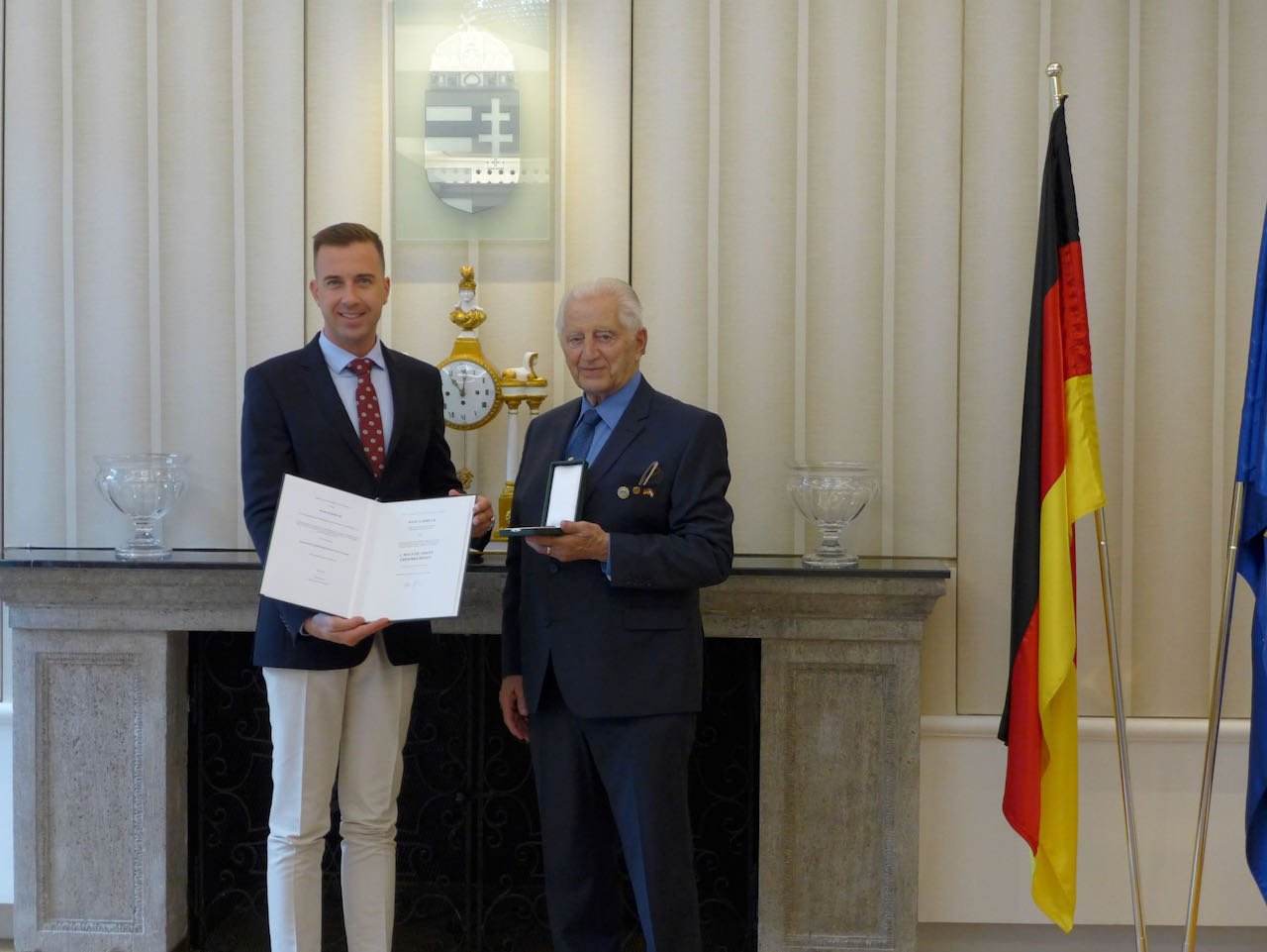 Der langjährige Vorsitzende der Landesmannschaft der Deutschen aus Ungarn Landesverband Bayern, Hans Schmuck, wurde von Staatspräsident János Áder mit dem Goldenen Verdienstkreuz von Ungarn ausgezeichnet. Die Auszeichnung überreichte Generalkonsul Gábor Tordai-Lejkó bei einer kleinen, gutgelaunten Feier am 22. Juli 2021 im Generalkonsulat in München.