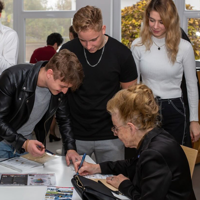 Nach ihrem Vortrag beantwortete Professorin Schuchardt bereitwillig Fragen und belohnte die interessierten Schülerinnen und Schüler mit einem Exemplar ihres Buches, das sie jeweils mit einer persönlichen Widmung versah.