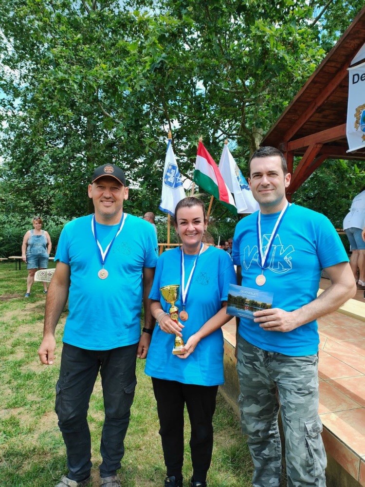 Das Team des Vereins für Ungarndeutsche Kinder holte 2022 den ersten Platz, so war die Herausforderung für uns als Titelverteidiger umso größer. Doch an diesem Tag wollten die Fische nicht so richtig beißen. Wir mussten mehrere Futtergeschmacksrichtungen ausprobieren, etliche Entfernungen abtasten, bis sich endlich kleinere und größere Fische meldeten. Brachsen, Giebel und Karpfen konnten diesmal ans Land gezogen werden. Es blieb bis zur letzten Minute spannend, denn wir wussten, dass die meisten wenig Fische gefangen haben, aber mit dem benachbarten Team lagen wir Kopf an Kopf und die Jungs am ersten Angelplatz sollen auch viel gefangen haben.