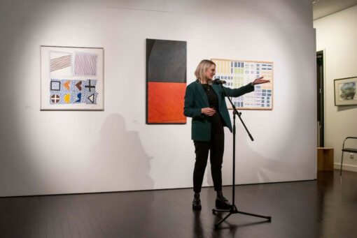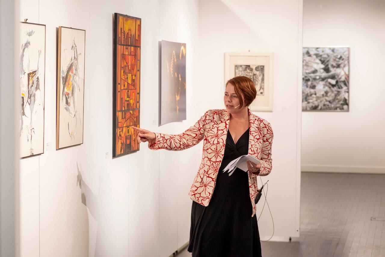 Die 2. Vorsitzende des VUdAK, Angela Korb, führte die Gäste der Finissage – größtenteils die Gruppe der AGDM-Mitglieder – durch die einzelnen Werke der Ausstellung, unterbrochen durch literarische Texte von ungarndeutschen Autoren. Sie verwies auf die Mehrstimmigkeit und Diversität in der künstlerischen Ausdrucksweise der einzelnen ausstellenden Künstler, auf die Vielfalt der Techniken, der Materialien, der Sicht- und Denkweisen sowie auf die Unterschiede der einzelnen Künstlerpersönlichkeiten.