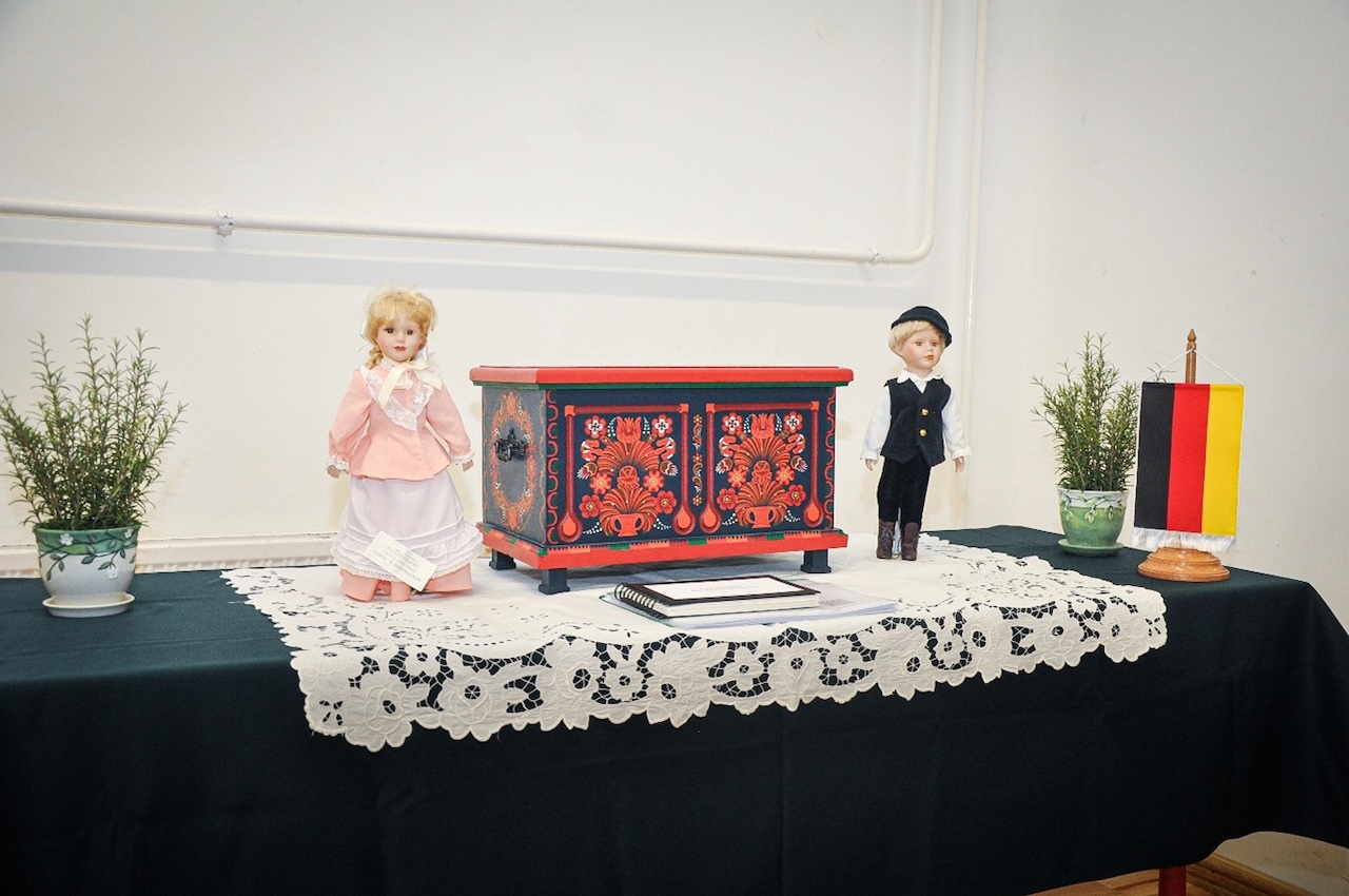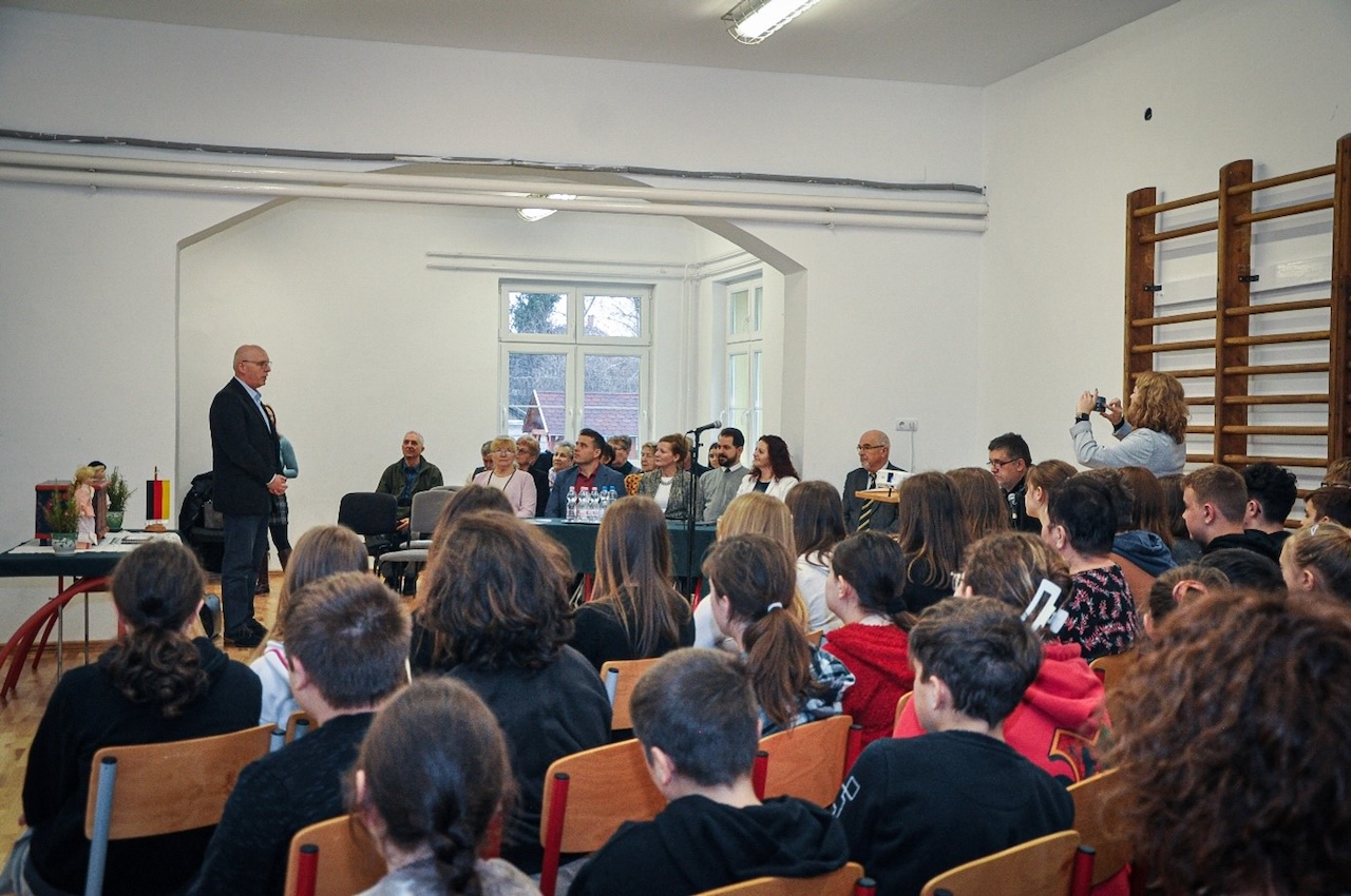 Die Projektergebnisse wurden am 5. Februar in der Grundschule vorgestellt und aus diesem Anlass zugleich der Wanderschlüssel offiziell empfangen. Dazu luden wir auch die deutschen Gemeinschaften der umliegenden Ortschaften ein, viele von ihnen nahmen diese auch wahr. Am Programm nahmen auch die Schüler der Grundschule teil, die beim Projekt mitmachten.