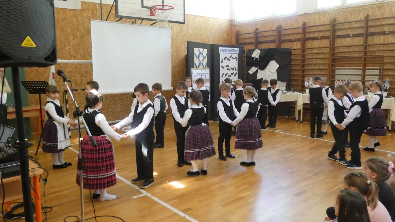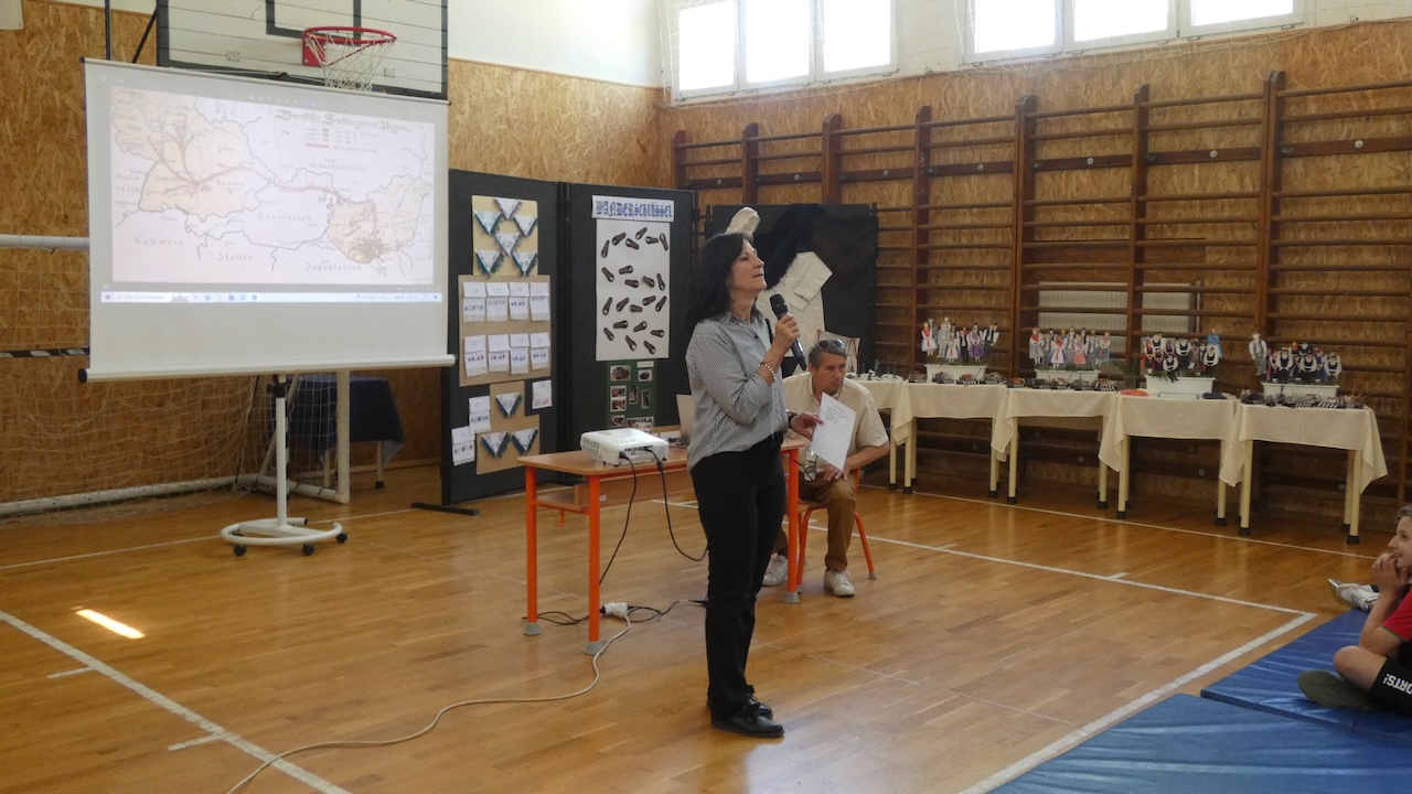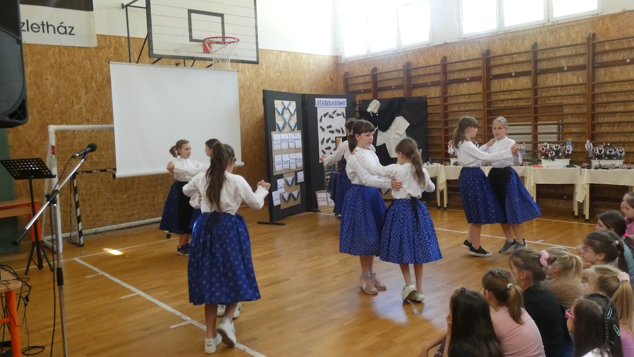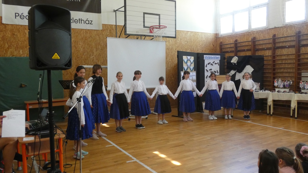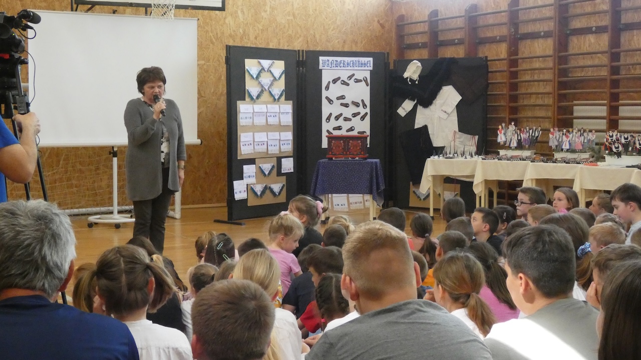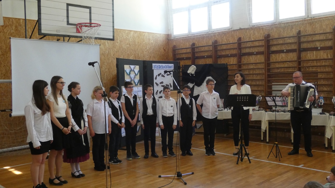 Die Abschlussveranstaltung begann mit zwei Vorträgen. Die Erst- und Zweitklässler lernten frühere Kinderspiele kennen, die Schüler der 3.-8. Klassen hörten sich einen Vortrag von Jakab Ferkov über die Ansiedlung der Ungarndeutschen an. Danach machten wir mit einem bunten Kulturprogramm weiter, bei dem zuerst Gabriella Hahner-Feth, die Vorsitzende der örtlichen deutschen Selbstverwaltung, das Projekt würdigte. Danach verzauberten uns die Kinder des Parkkindergartens, die in wunderschöner Tracht Kinderspiele vorgetragen haben. An diesem Nachmittag traten auch Schüler mit Gedichten und Mundartgeschichten auf, unser Chor sang schöne Volkslieder und die Tanzgruppe trug lustige Volkstänze vor.