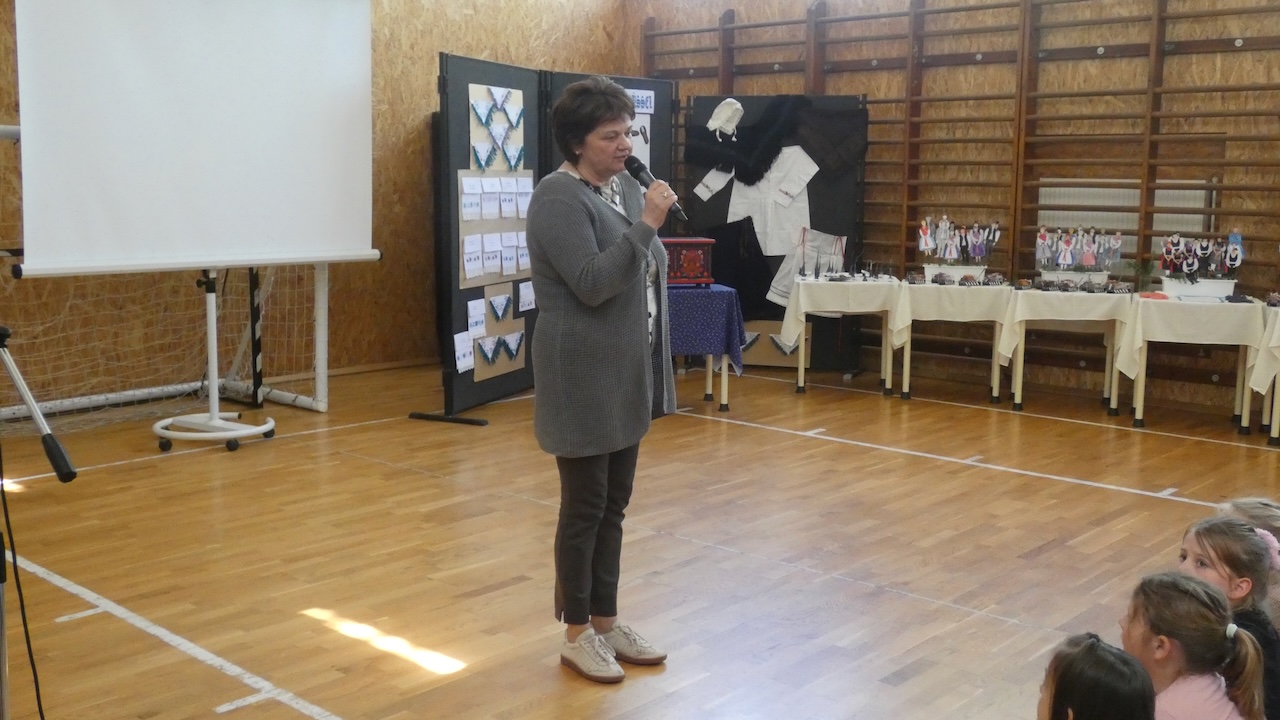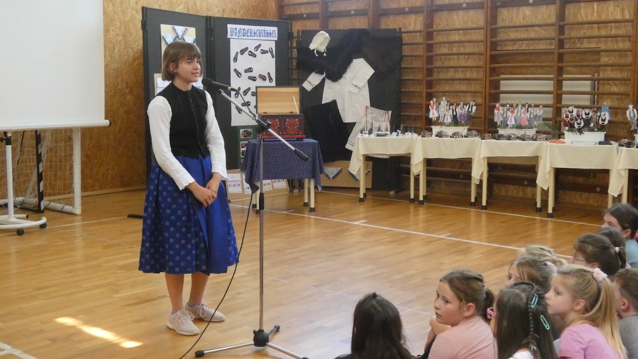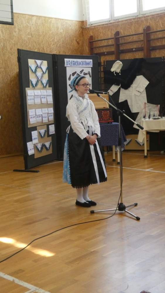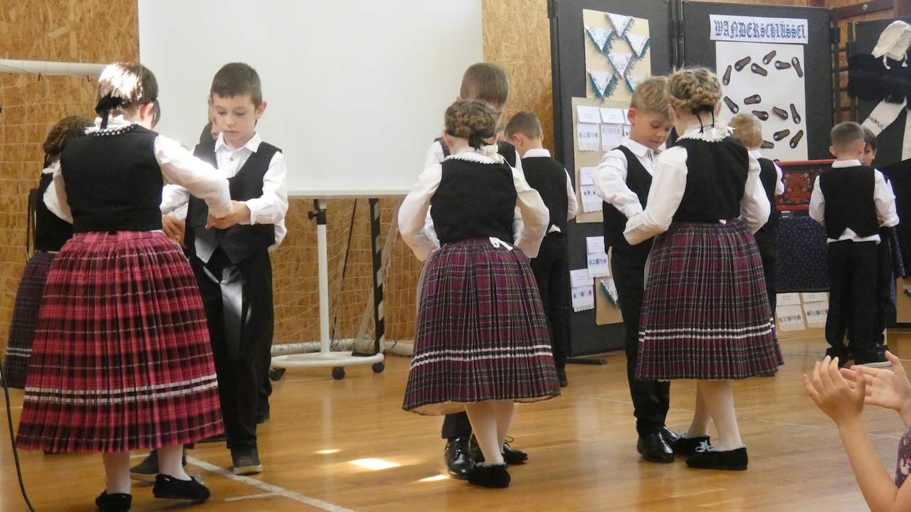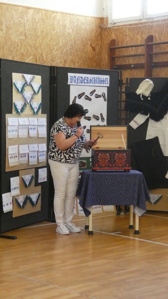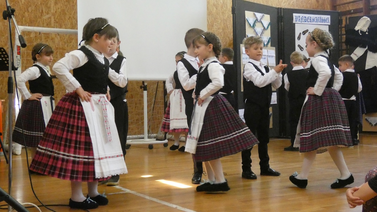 Die Abschlussveranstaltung begann mit zwei Vorträgen. Die Erst- und Zweitklässler lernten frühere Kinderspiele kennen, die Schüler der 3.-8. Klassen hörten sich einen Vortrag von Jakab Ferkov über die Ansiedlung der Ungarndeutschen an. Danach machten wir mit einem bunten Kulturprogramm weiter, bei dem zuerst Gabriella Hahner-Feth, die Vorsitzende der örtlichen deutschen Selbstverwaltung, das Projekt würdigte. Danach verzauberten uns die Kinder des Parkkindergartens, die in wunderschöner Tracht Kinderspiele vorgetragen haben. An diesem Nachmittag traten auch Schüler mit Gedichten und Mundartgeschichten auf, unser Chor sang schöne Volkslieder und die Tanzgruppe trug lustige Volkstänze vor.