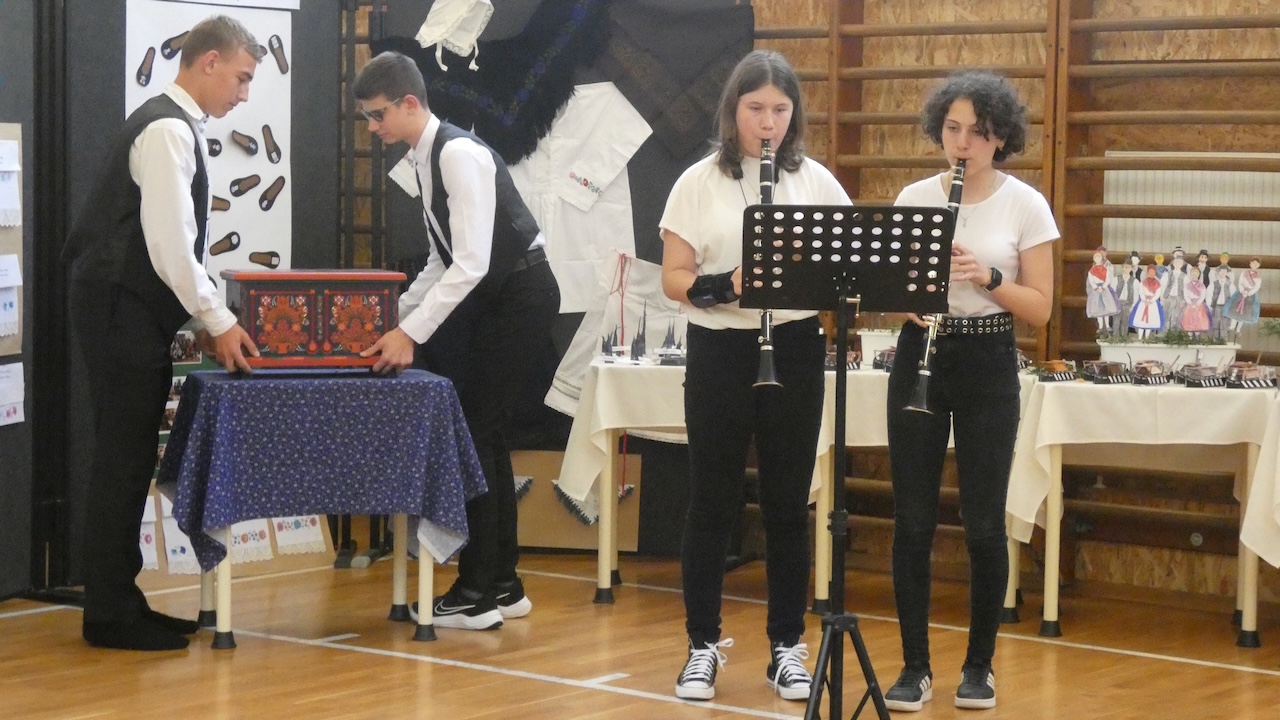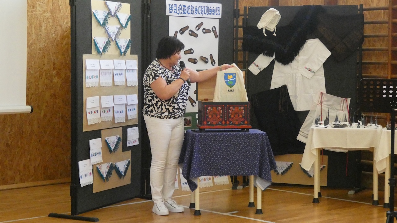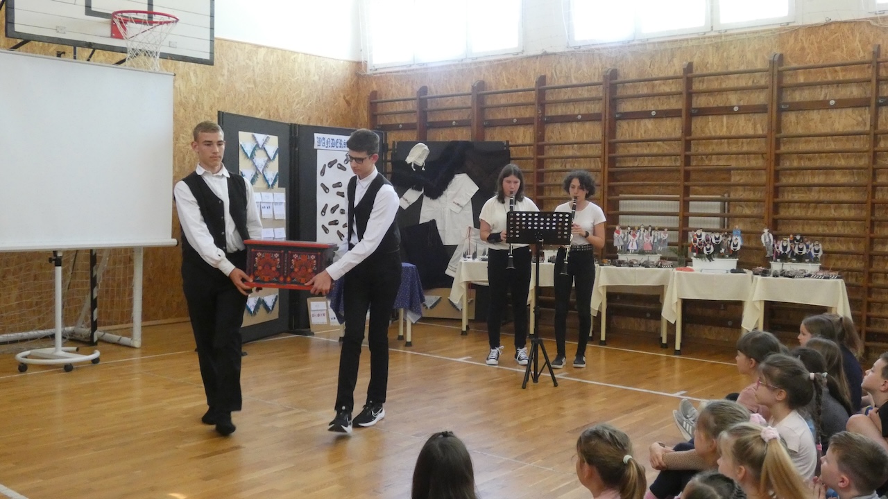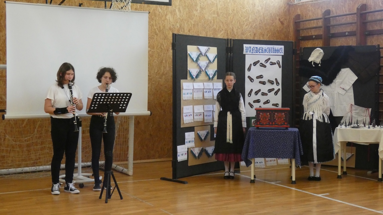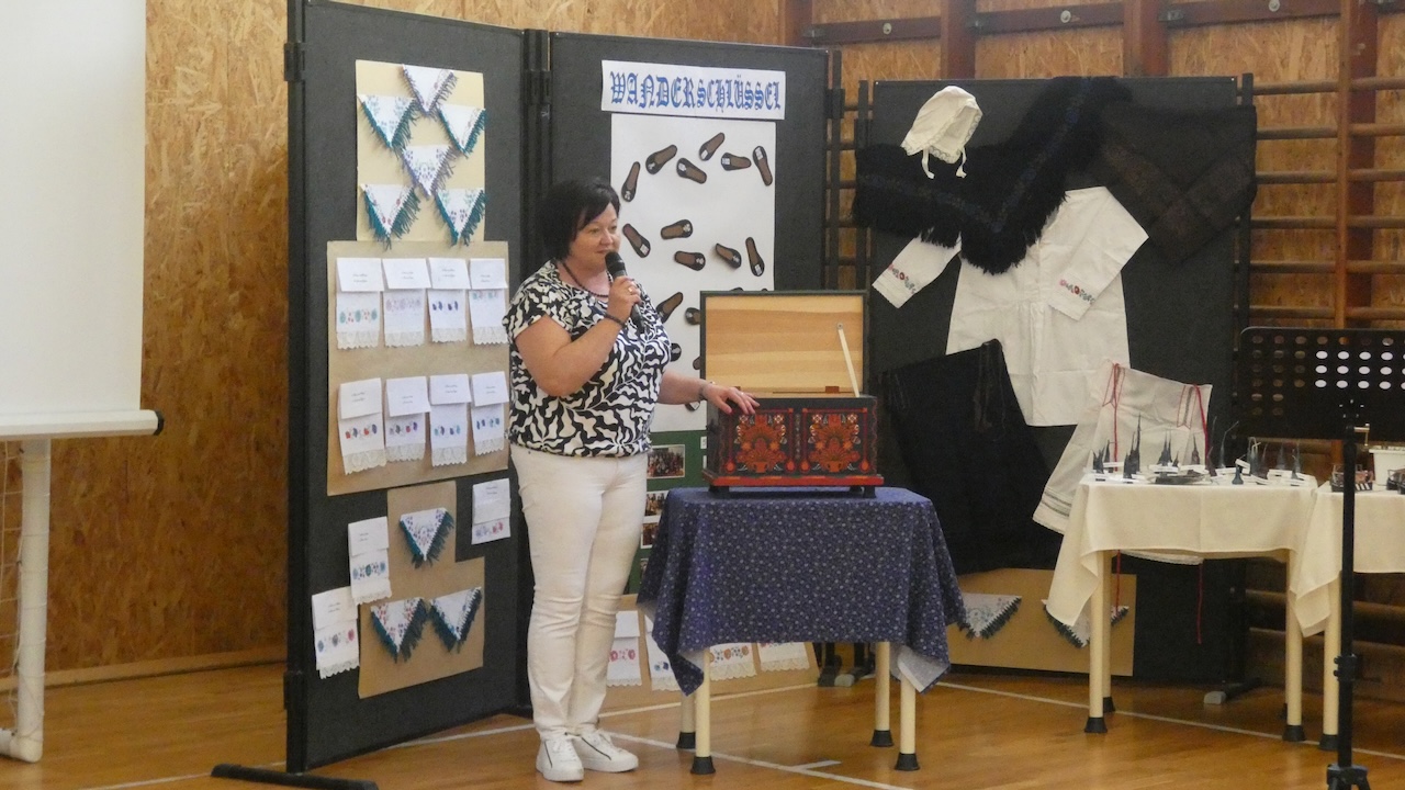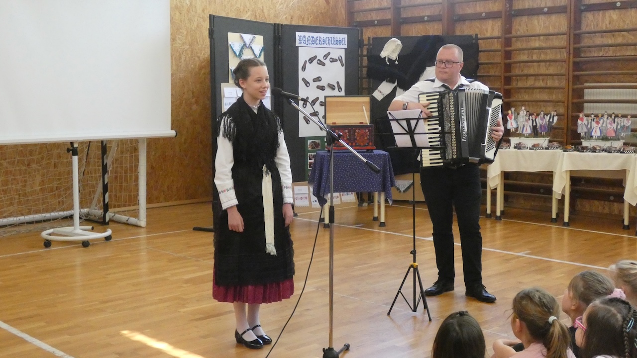Die Abschlussveranstaltung begann mit zwei Vorträgen. Die Erst- und Zweitklässler lernten frühere Kinderspiele kennen, die Schüler der 3.-8. Klassen hörten sich einen Vortrag von Jakab Ferkov über die Ansiedlung der Ungarndeutschen an. Danach machten wir mit einem bunten Kulturprogramm weiter, bei dem zuerst Gabriella Hahner-Feth, die Vorsitzende der örtlichen deutschen Selbstverwaltung, das Projekt würdigte. Danach verzauberten uns die Kinder des Parkkindergartens, die in wunderschöner Tracht Kinderspiele vorgetragen haben. An diesem Nachmittag traten auch Schüler mit Gedichten und Mundartgeschichten auf, unser Chor sang schöne Volkslieder und die Tanzgruppe trug lustige Volkstänze vor.