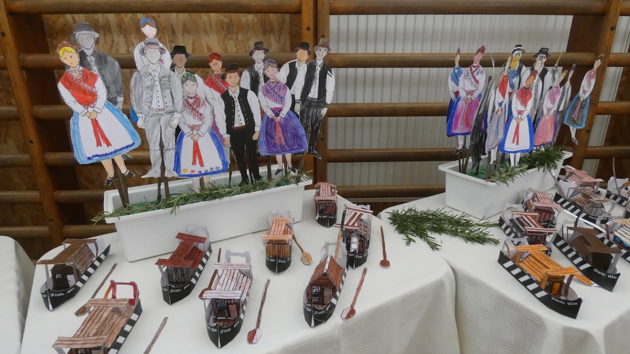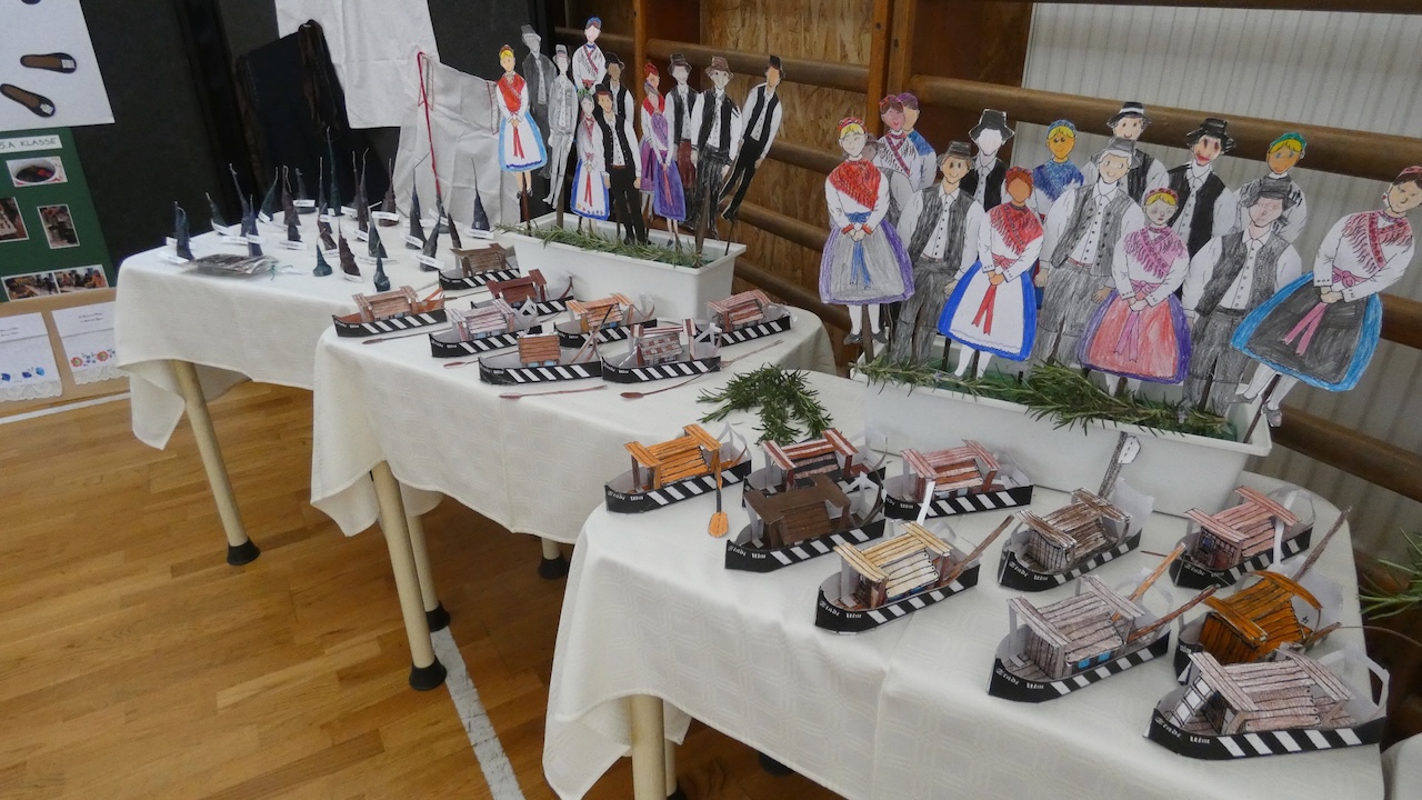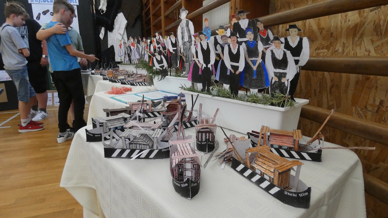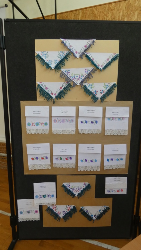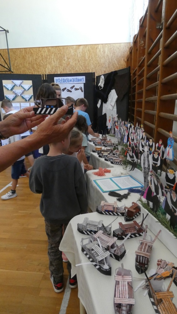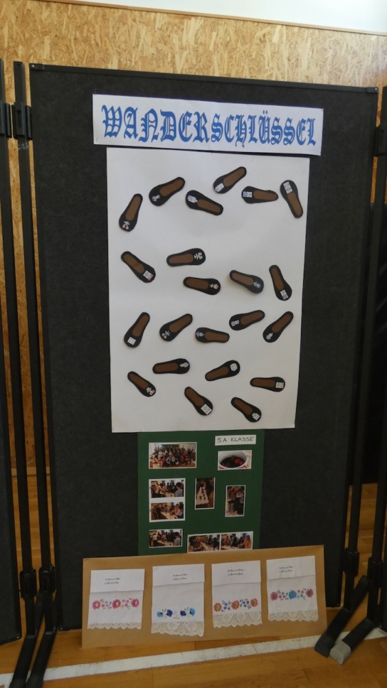 Die Vorbereitungen begannen schon eine Woche vorher: Jede Klasse bearbeitete ein eigenes Thema und stellte auch selbst ein Produkt her (Ulmer Schachtel, Halstücher, Handtücher aus Papier, Kerzen). So ist in unserer Schule eine schöne Ausstellung für die Abschiedsfeier entstanden.