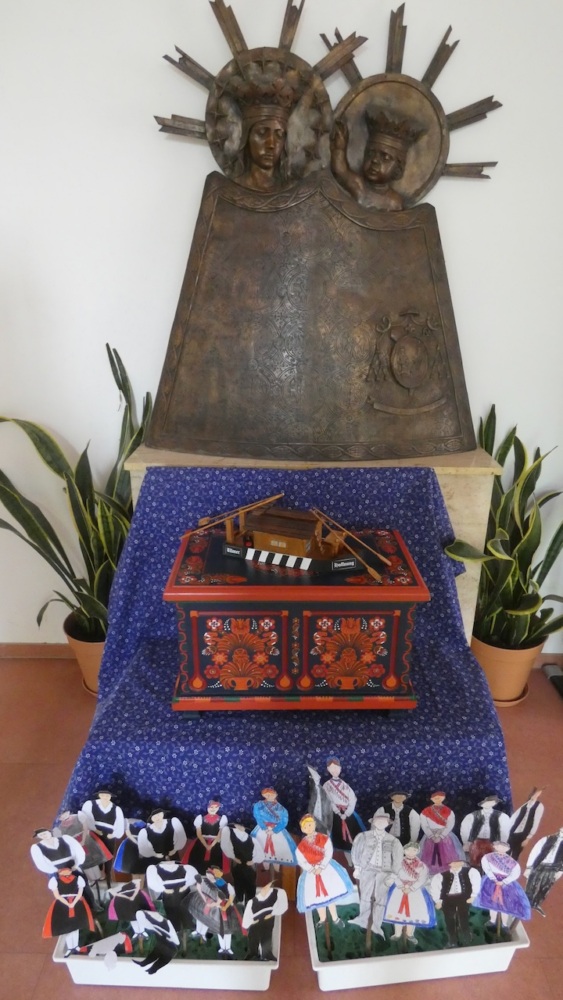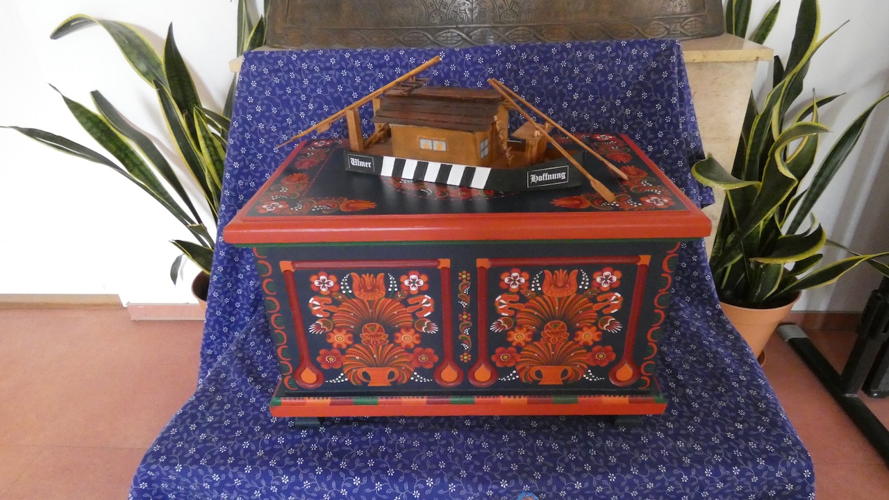 Zum Schluss legten wir auch unsere „Schätze“ in die bemalte Truhe: Ein „Ulmer Schachtel“-Schiffsmodell aus Holz und auf einem USB-Stick ein langes Video über die Veranstaltung.