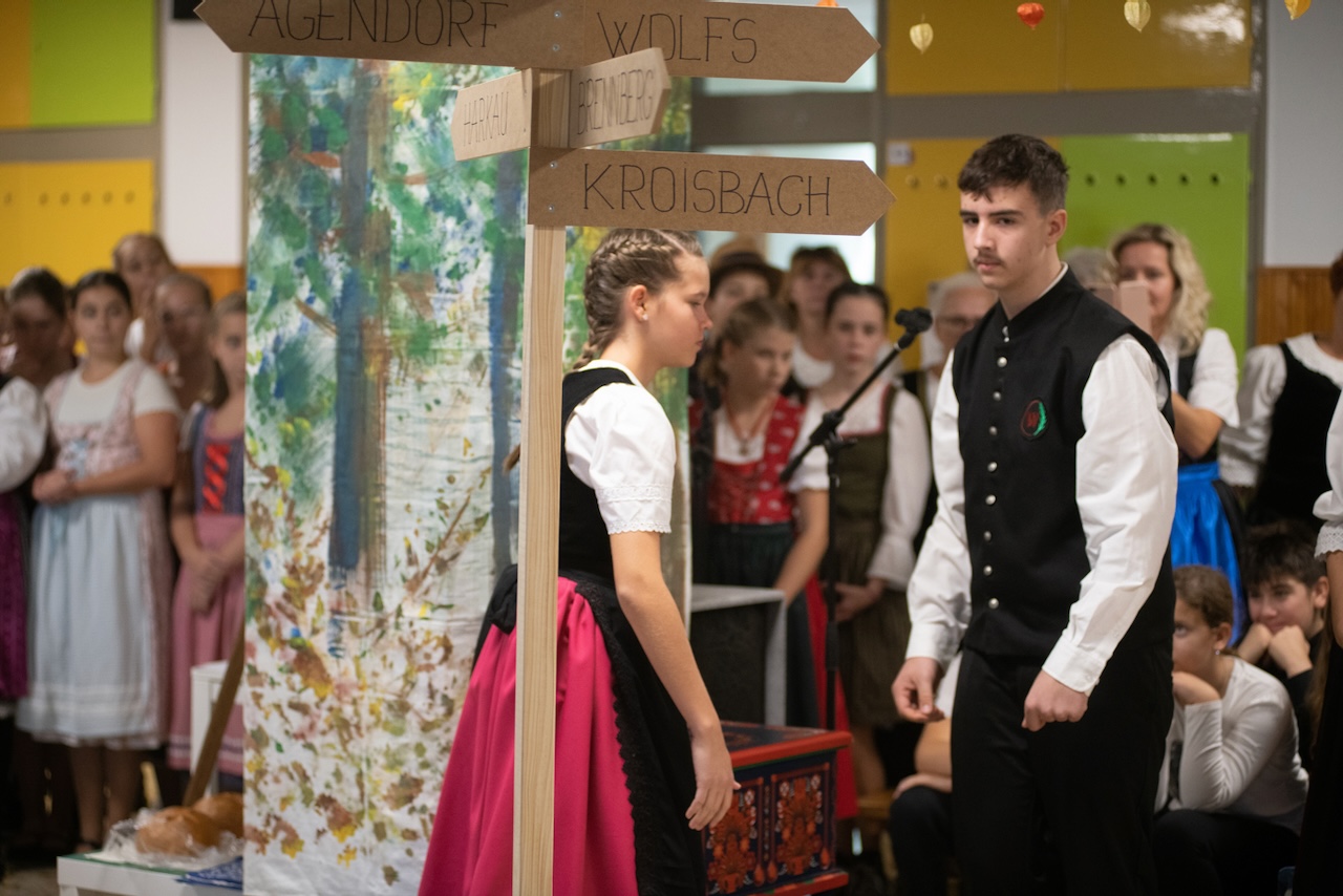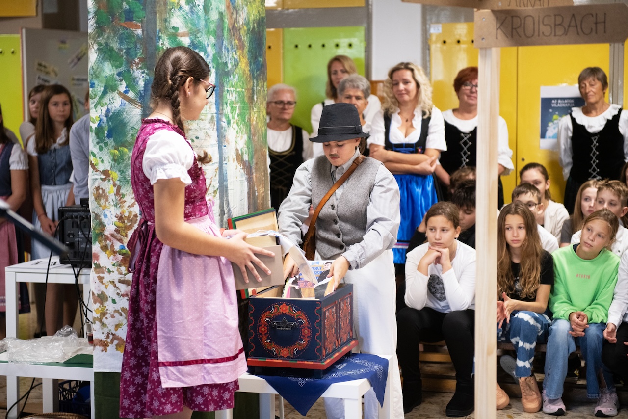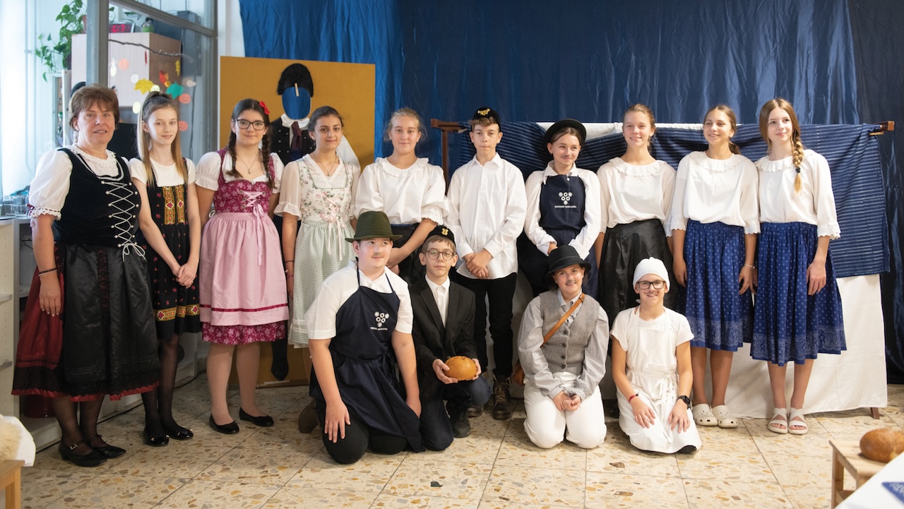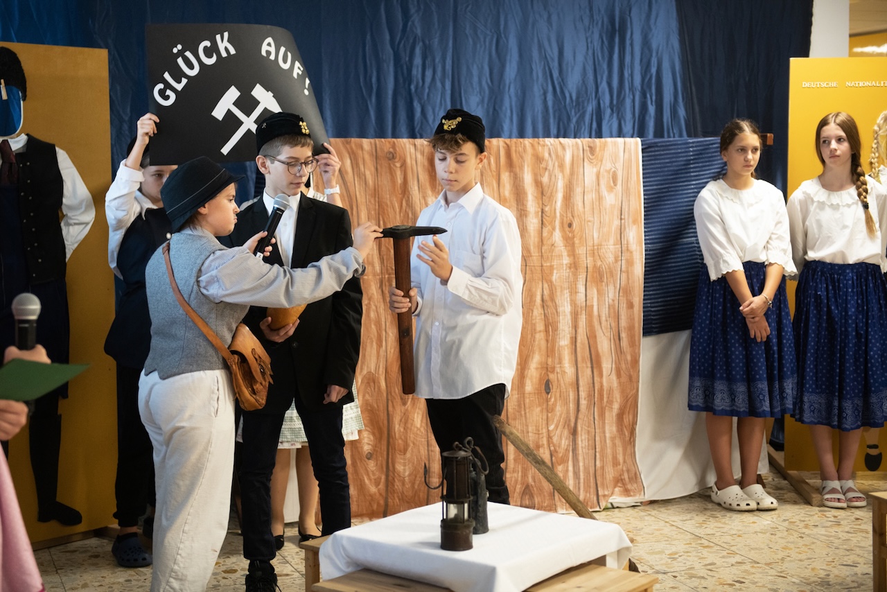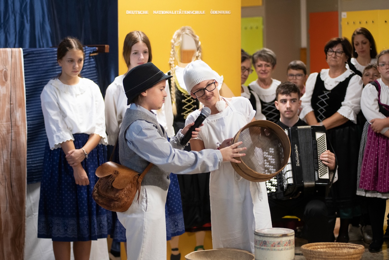 Dem folgte eine Rede von Magdalena Krisch, der Vorsitzenden der Deutschen Selbstverwaltung Ödenburg/Sopron. Anschließend wurde von der Klasse 7A eine Szene mit dem Titel „Die Geschichte vom Bäcker Bernhard” aufgeführt, die für diesen Anlass von unserer Kollegin, Tímea Albrecht, geschrieben und auf die Bühne gestellt wurde. Im Stück wird das Leben der in Ödenburg und in der Umgebung lebenden Deutschen geschildert.