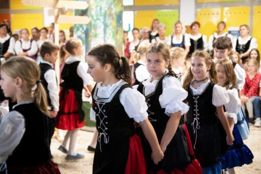 Die Direktorin unserer Schule, Noémi Torma-Bakody, nahm die Truhe mit dem Wanderschlüssel feierlich entgegen. Danach gab es ein Programm mit der Volkstanzgruppe unserer Schule unter der Leitung des Volkstanzpädagogen Béla Kadnár.