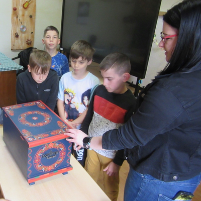 Die Schüler zeichneten den Wanderschlüssel, und aus den Illustrationen wurde eine Ausstellung erstellt. Die Schüler stellten auch eine PowerPoint-Präsentation zusammen. Zum Schluss legten wir kleine Erinnerungsstücke in die Wandertruhe.