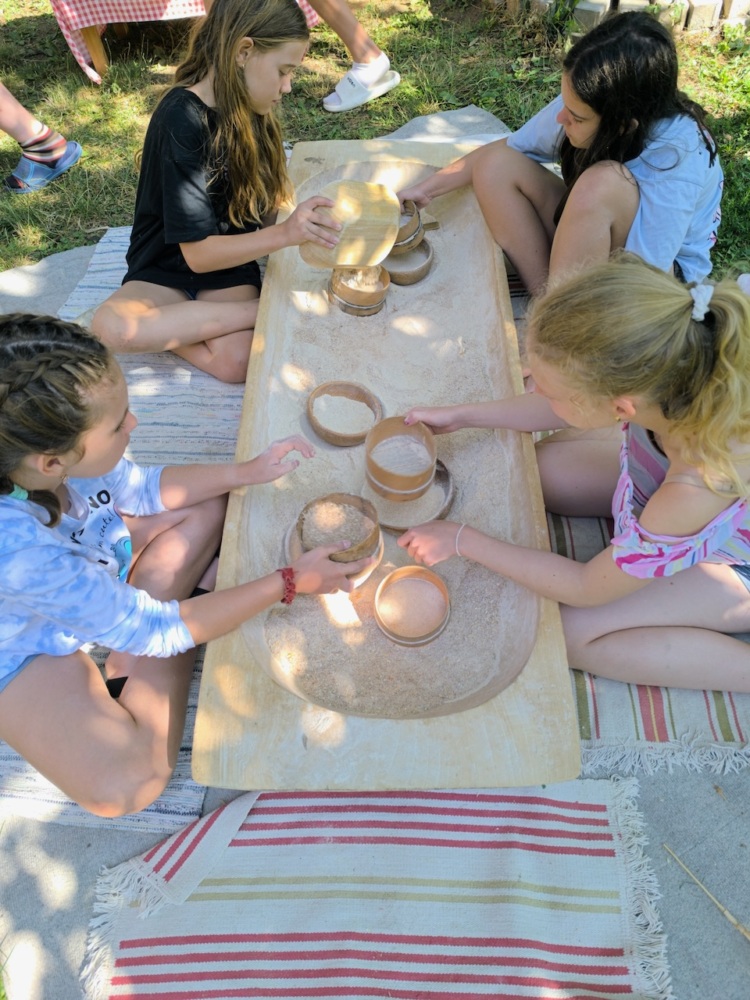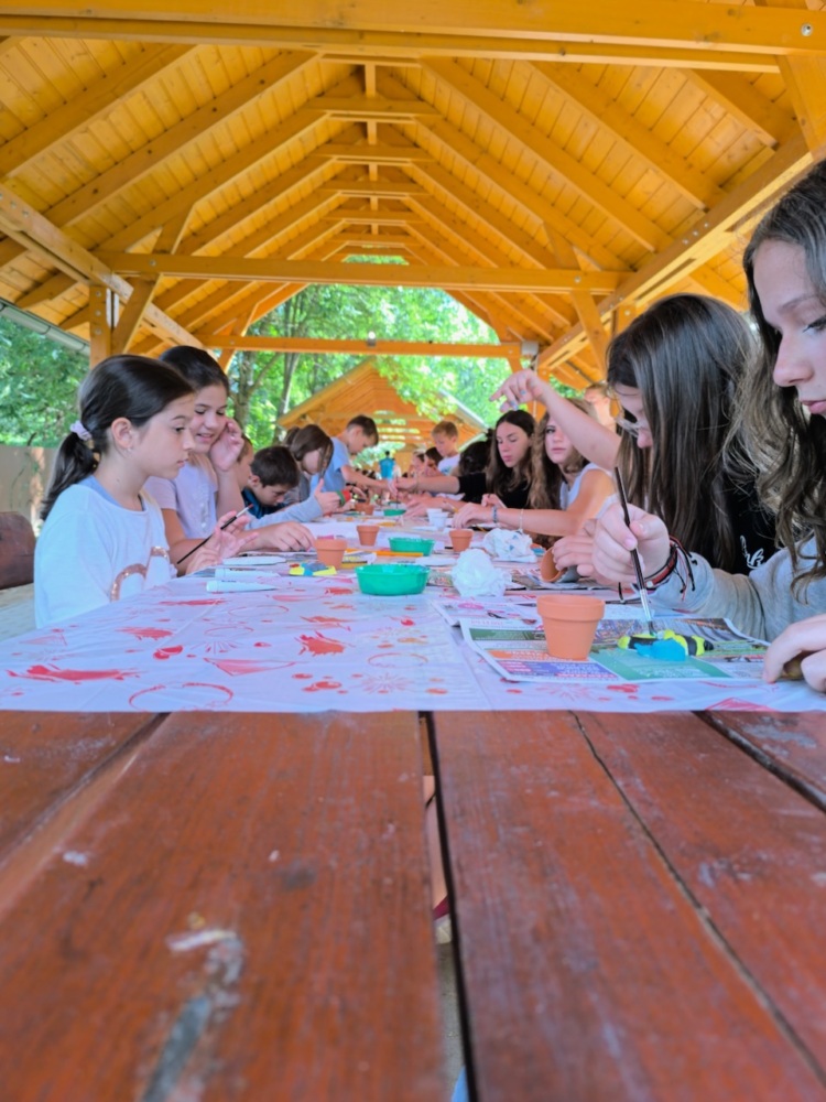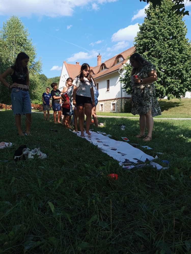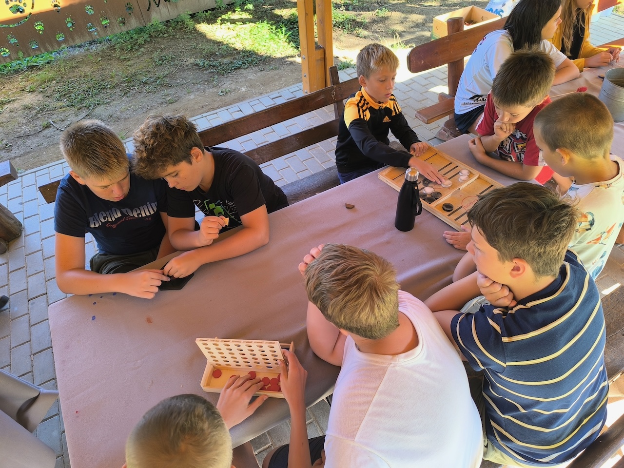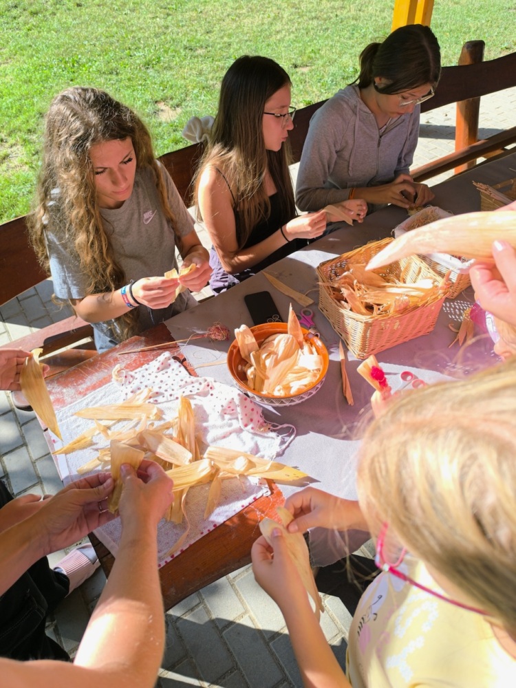 Die Kinder hatten viel Spaß bei den Logik- und Geschicklichkeitsspielen der Förderpädagogin Krisztina Csordás und im mobilen traditionsbewahrenden sog. „Spielhaus“, das mehrere Handwerkerbeschäftigungen mit Leder bzw. getrockneten Maisblättern, aber auch traditionelle Tätigkeiten wie z. B. Getreide mahlen und Mehl sieben, anbot. Diese sprachen nicht nur die jungen Teilnehmer, sondern auch die älteren an. Das Scharadenspiel, die Werwolfrunden und viele andere Gesellschaftsspiele waren ebenfalls beliebte Aktivitäten, auch das gemeinsame Tanzen durfte nicht fehlen. Zum Abschluss des Sommercamps feierten wir am letzten Abend eine große Abschiedsparty, bei der gesungen, getanzt und unter freiem Himmel gespielt wurde.