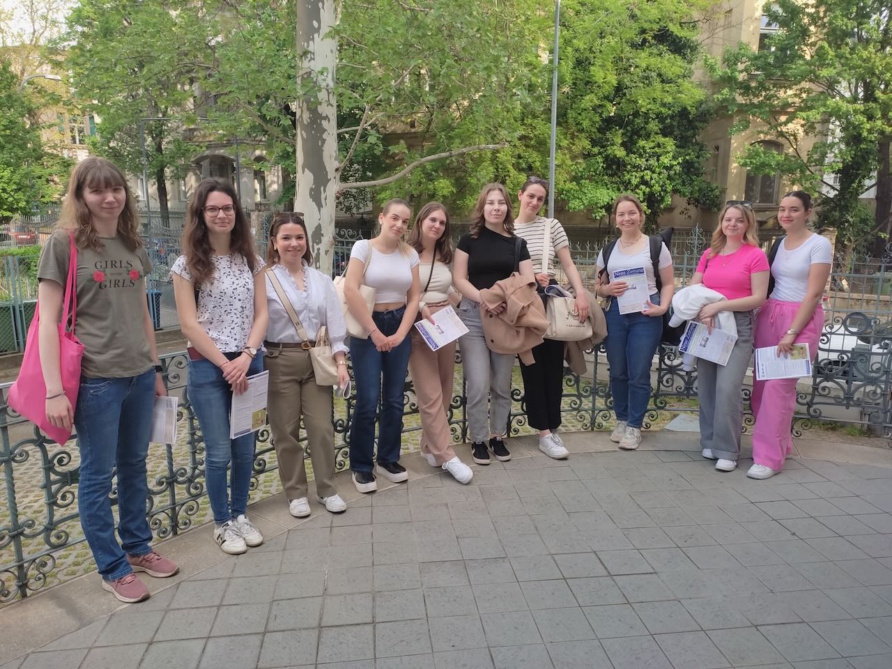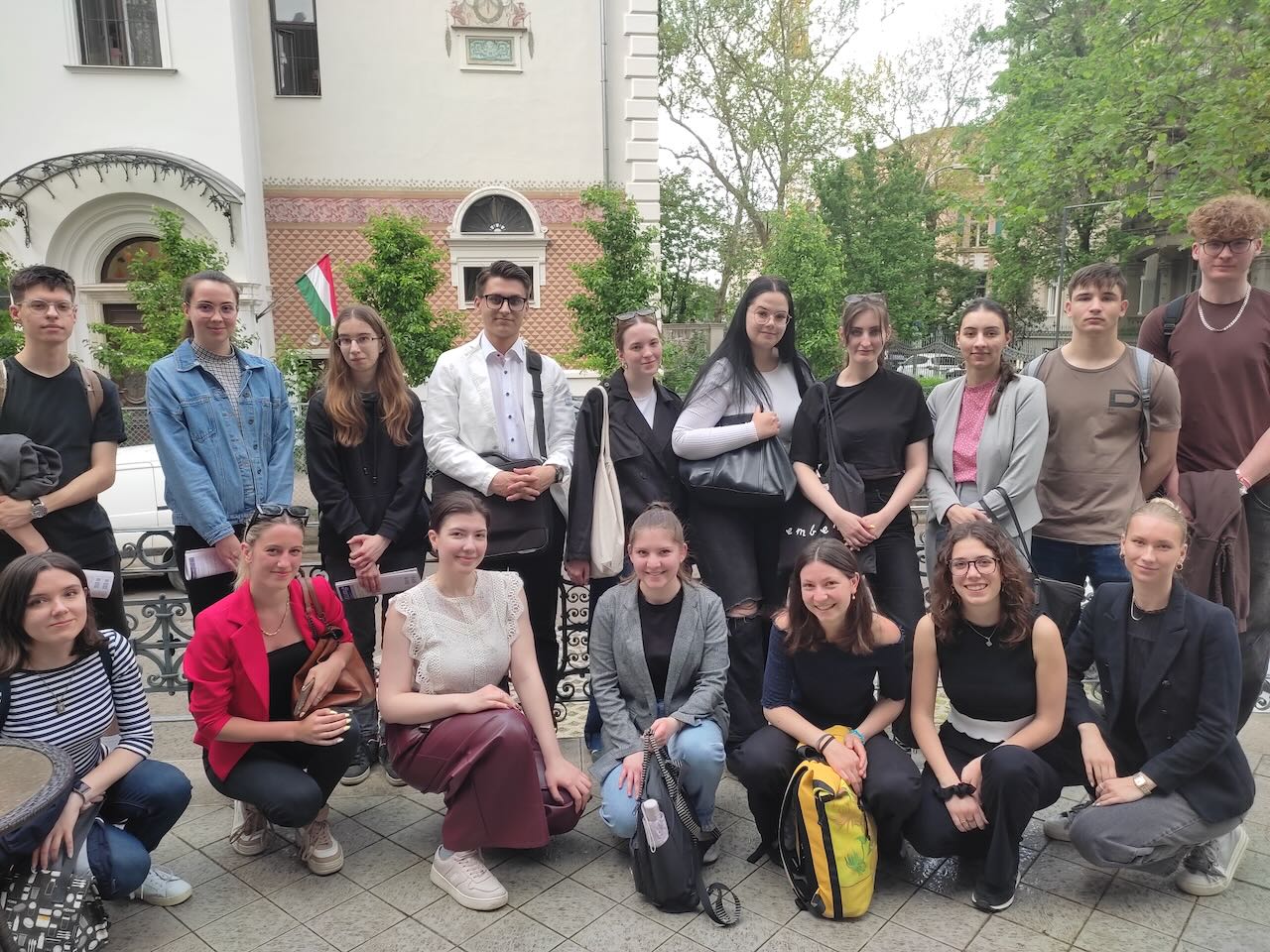 Am Ende des Programms versammelt sich die Gruppe draußen und macht ein gemeinsames Foto – ein schönes Andenken an einen lehrreichen und spannenden Tag in der Welt der ungarndeutschen Kultur. Die im Haus der Ungarndeutschen verbrachten Stunden tragen wesentlich dazu bei, dass die Studenten die Bedeutung der Kultur verstehen.